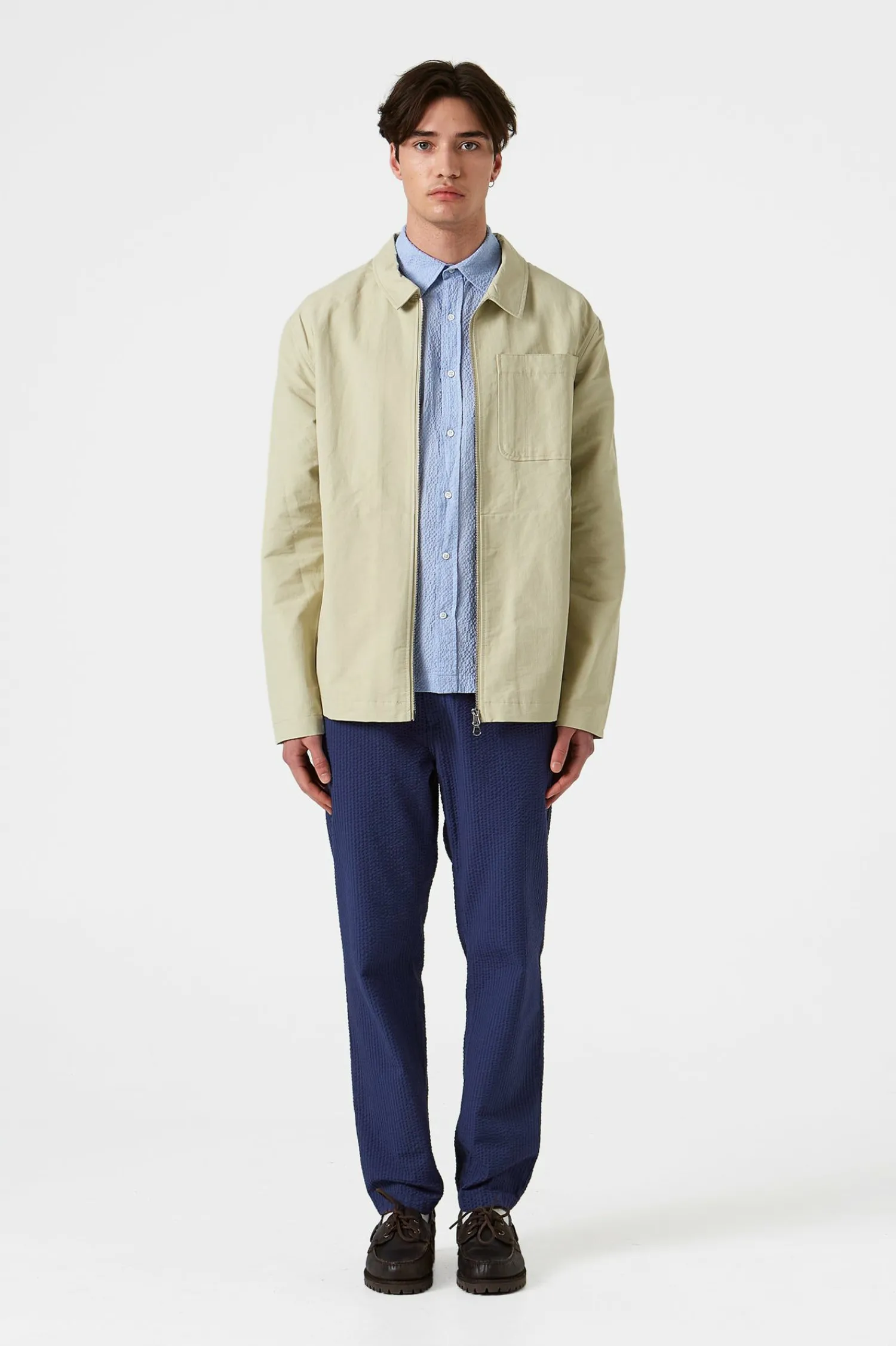 Chaqueta De Corte Recto En Color Beige Liso. Tiene Un Bolsillo En El Pecho. Se Completa Con Cierre De Cremallera.