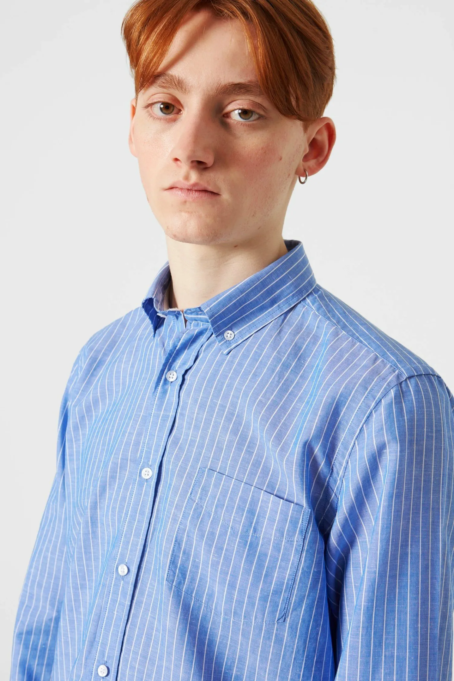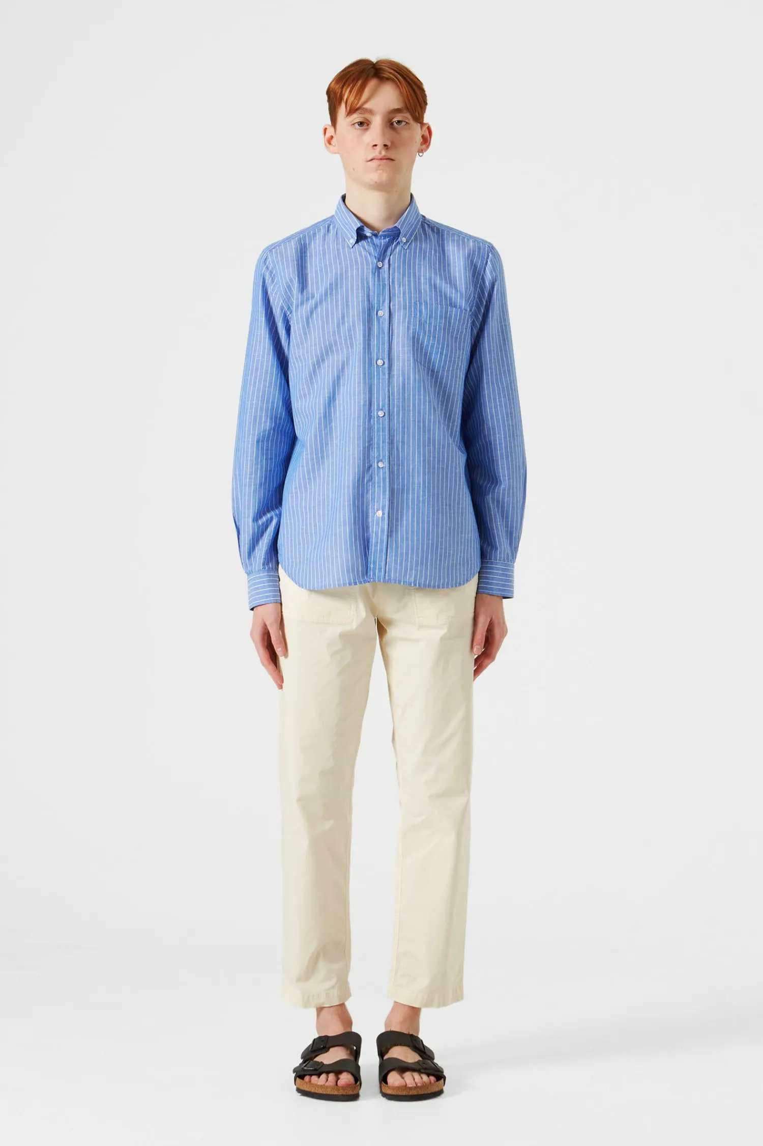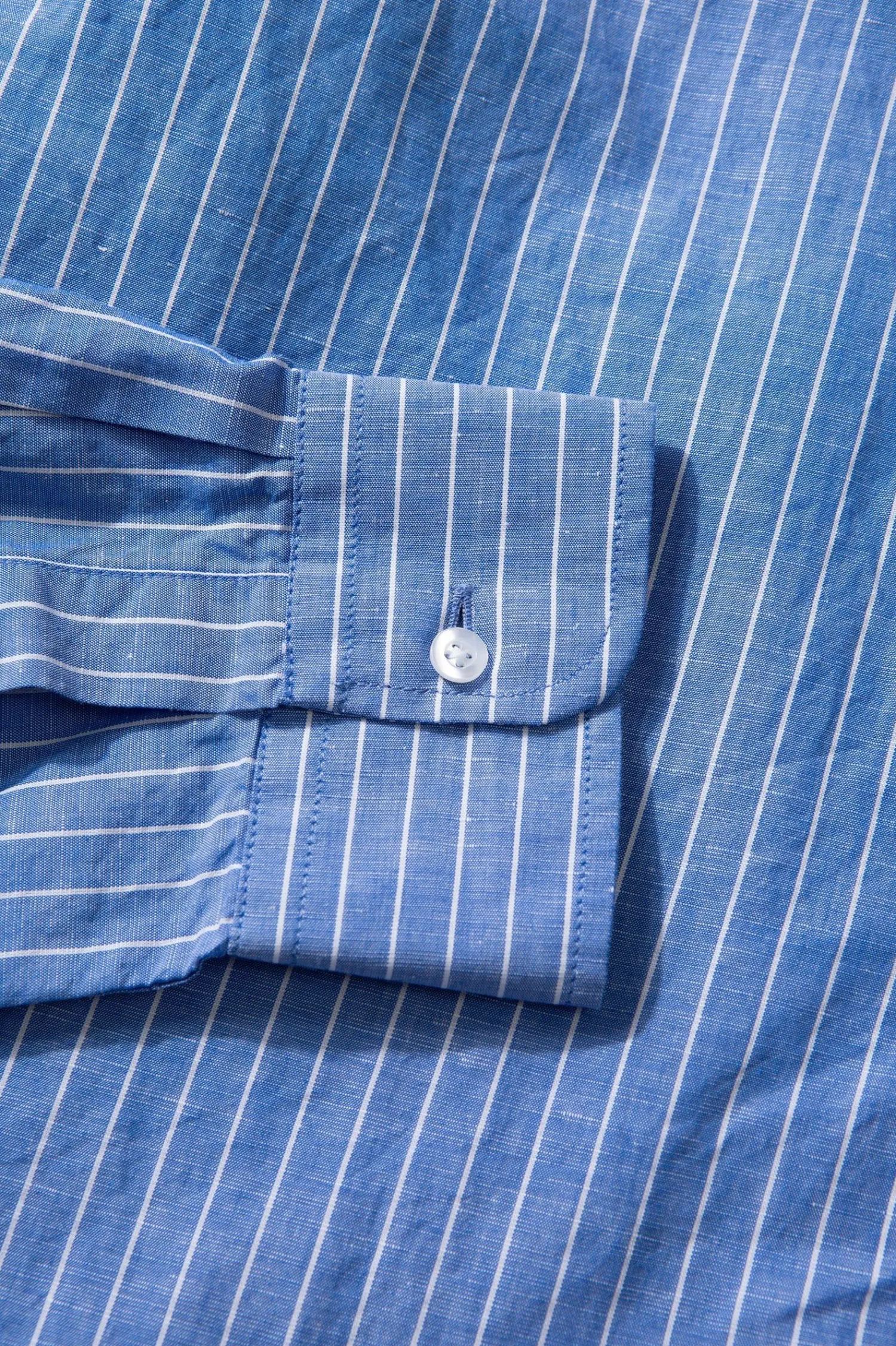 Camisa Formal Con Diseno Clasico De Mangas Largas Y Botones. Tiene Lineas Verticales Paralelas De Color Blanco. El Corte De La Camisa Es Recto Terminando En Un Bajo Redondeado, Con Un Cuello De Tipo Americano. No Tiene Distintivos Ni Bolsillos.