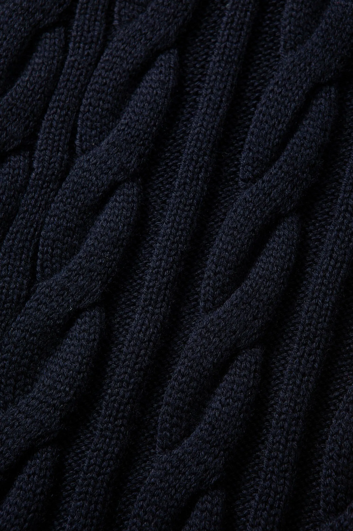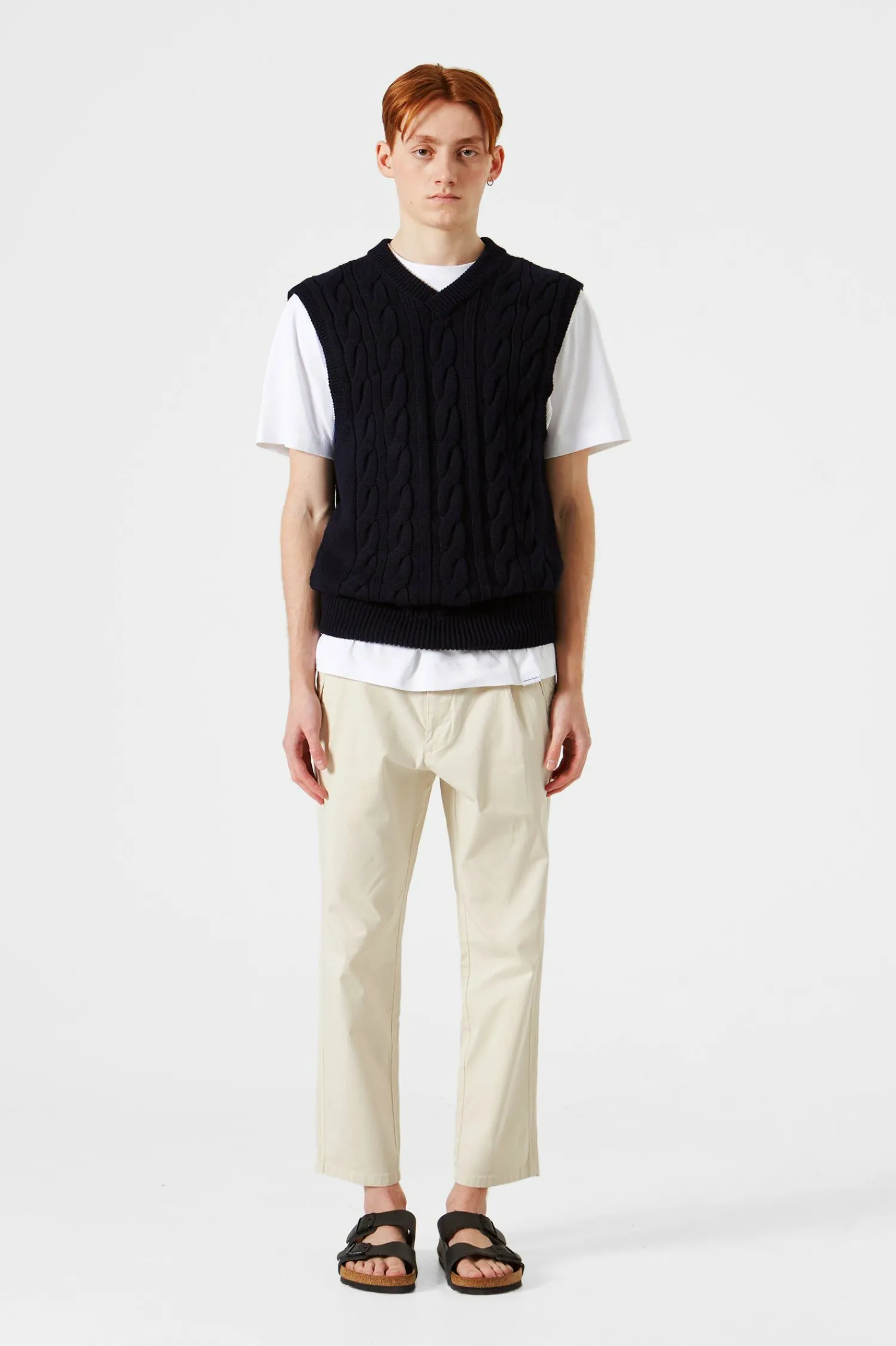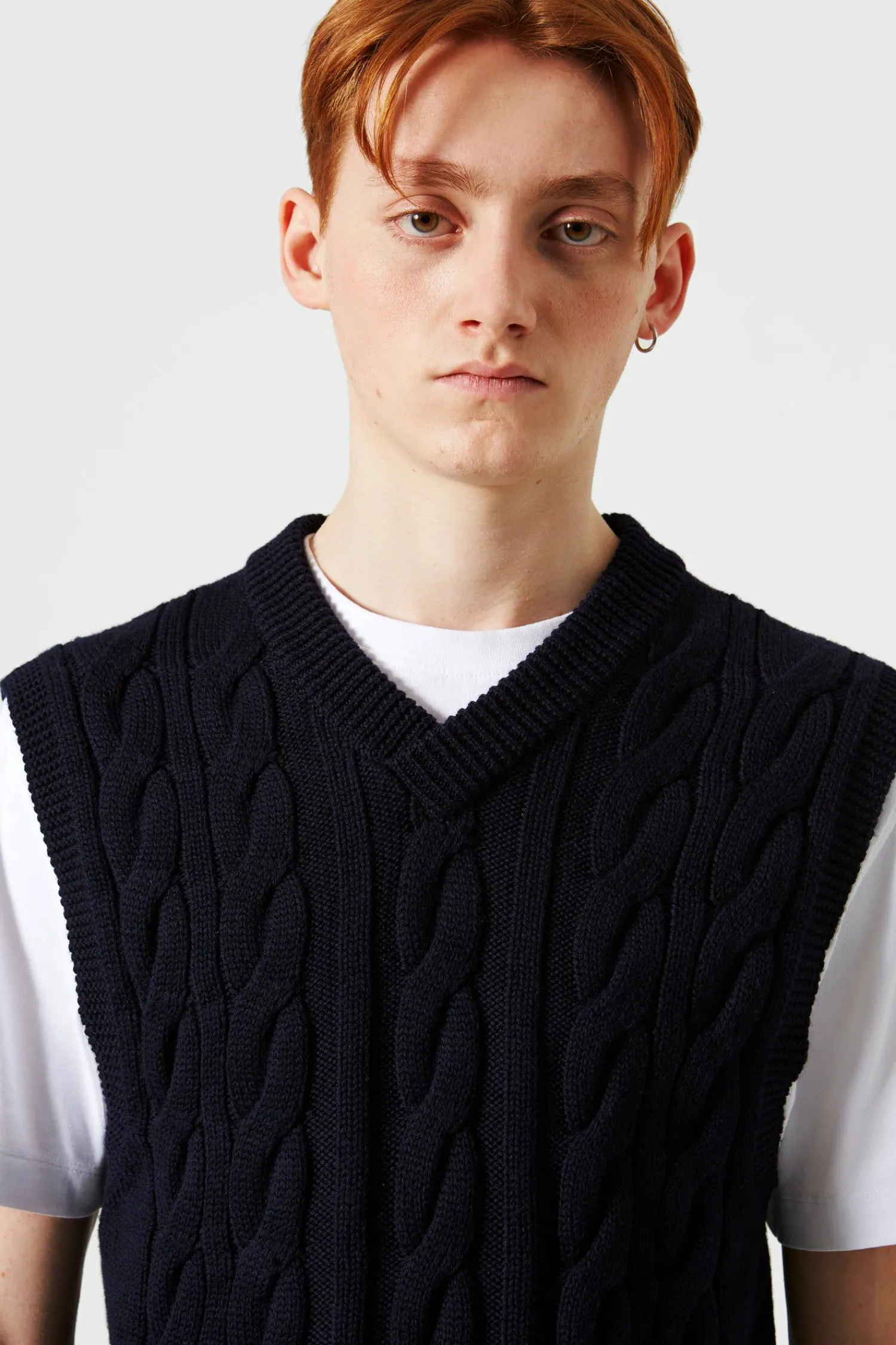 Chaleco Trenzado De Color Azul. Presenta Un Bajo Con Tejido Canale Y Bordes Gruesos Para Los Brazos Y El Cuello. El Acabado Trenzado Esta Conformado Por Cinco Tejidos En Forma De Trenza, Distribuidos Entre Los Laterales Frontales Y El Centro. Tambien Cuenta Con Lineas Rectas Mas Gruesas.