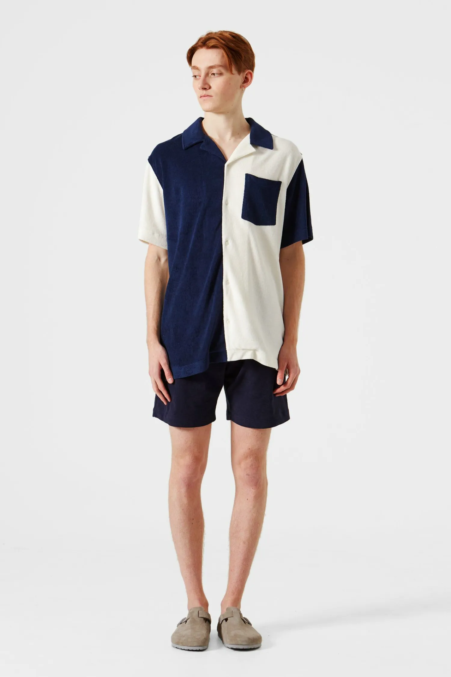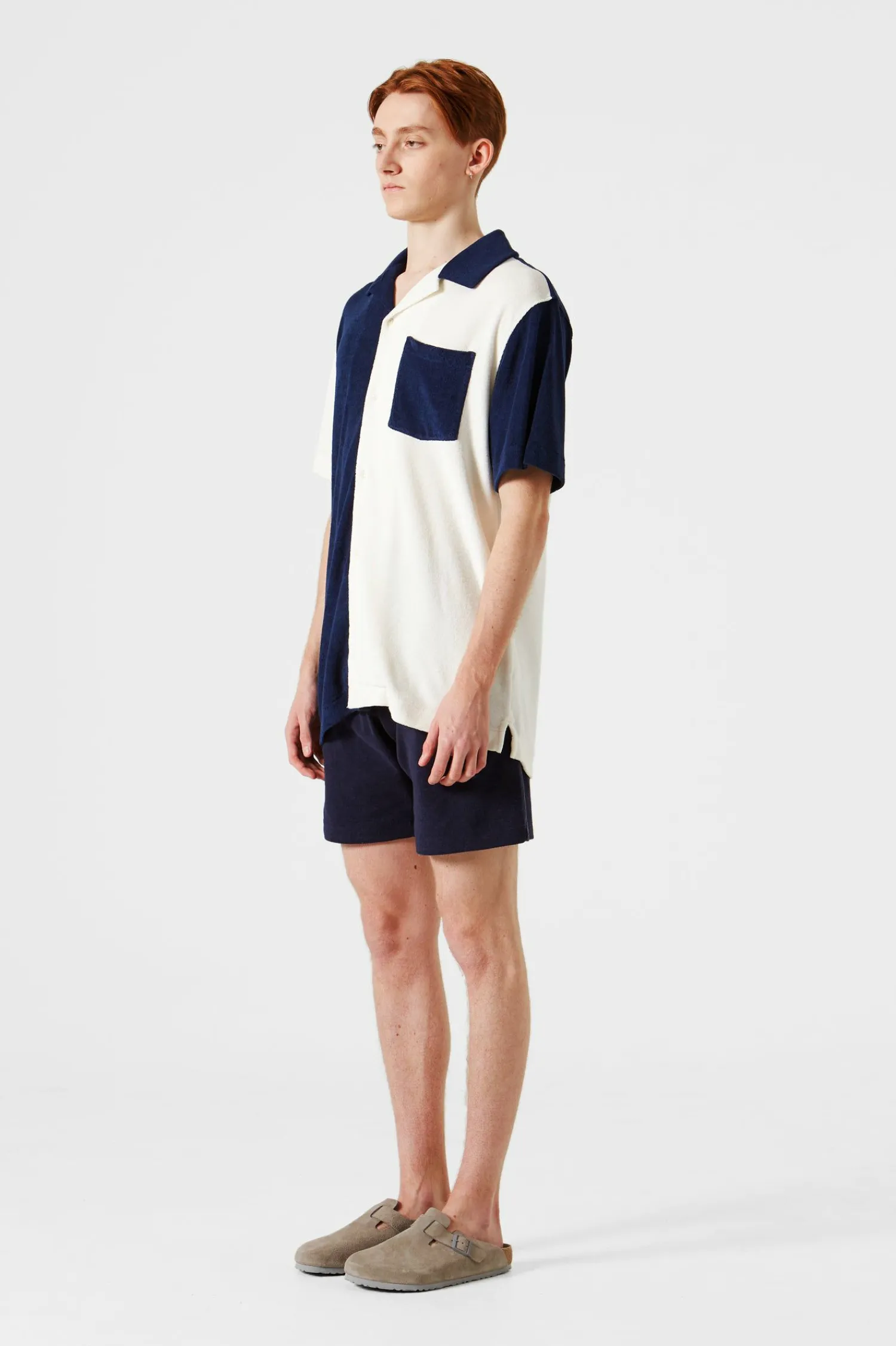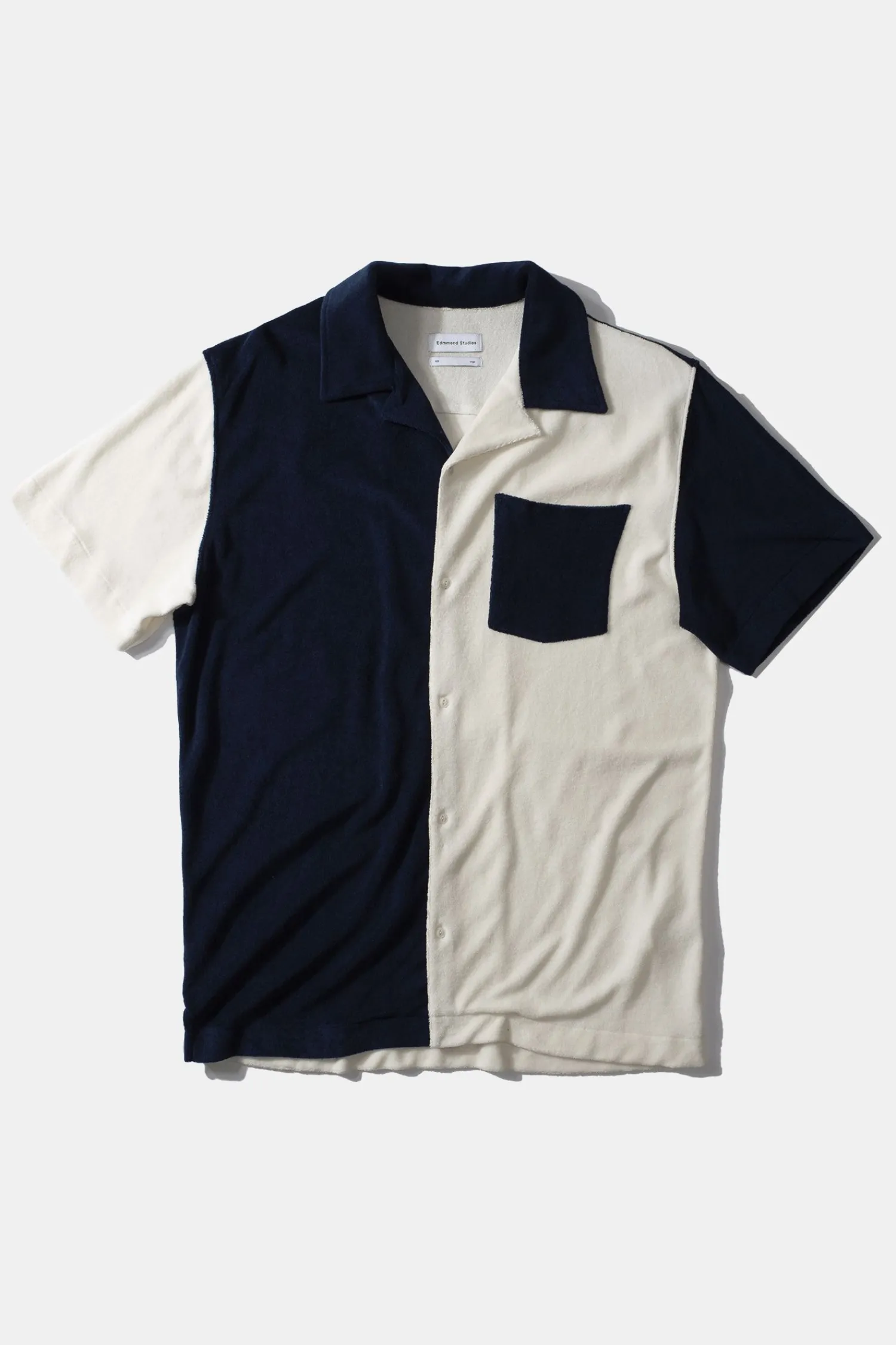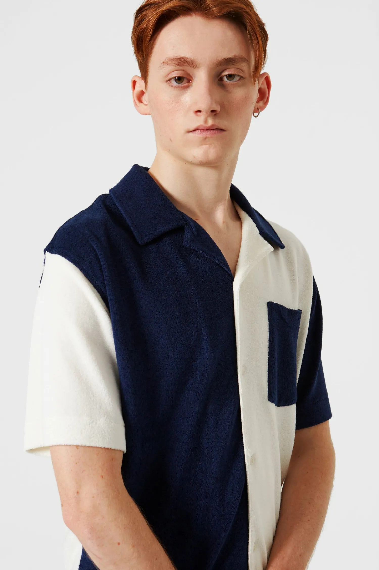 Camisa Bicolor De Estilo Minimalista. De Tejido Modal, Comodo, Ligero Y Suave Al Tacto. Tiene Un Bolsillo En El Lado Izquierdo Del Pecho Y Mangas Cortas Clasicas. El Corte De La Pieza Es Recto Y Termina En Un Dobladillo Recto Con Cuello Abierto.