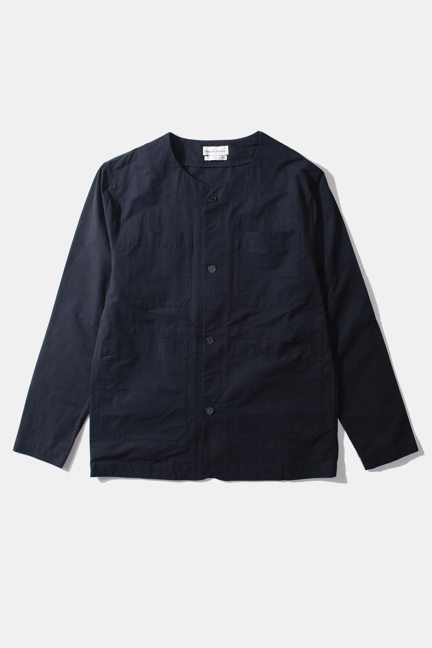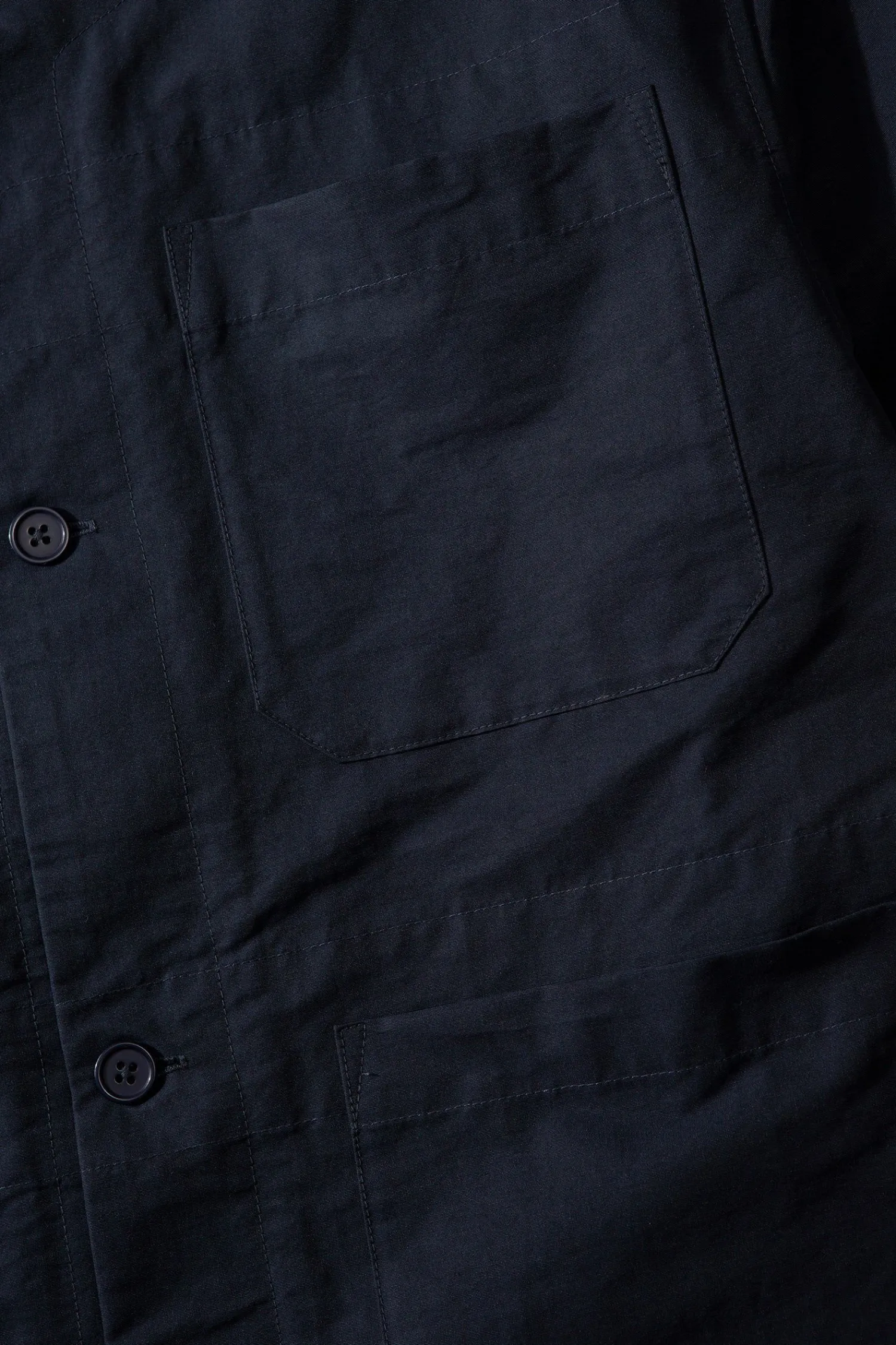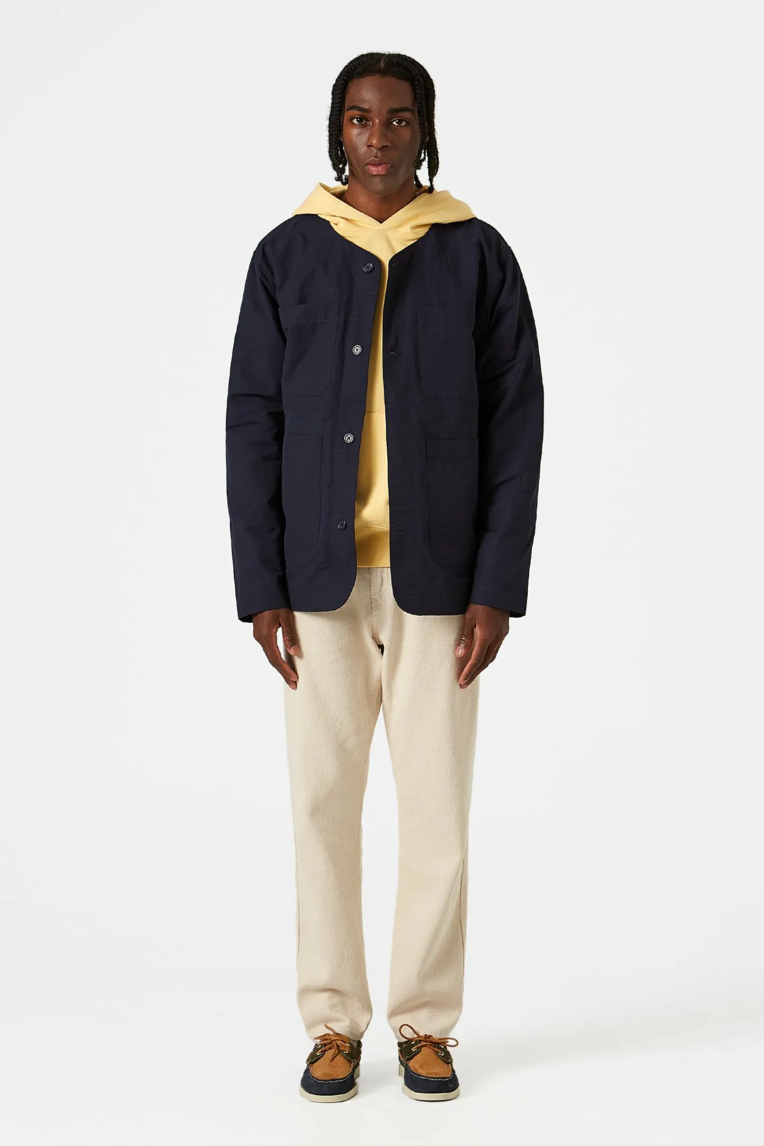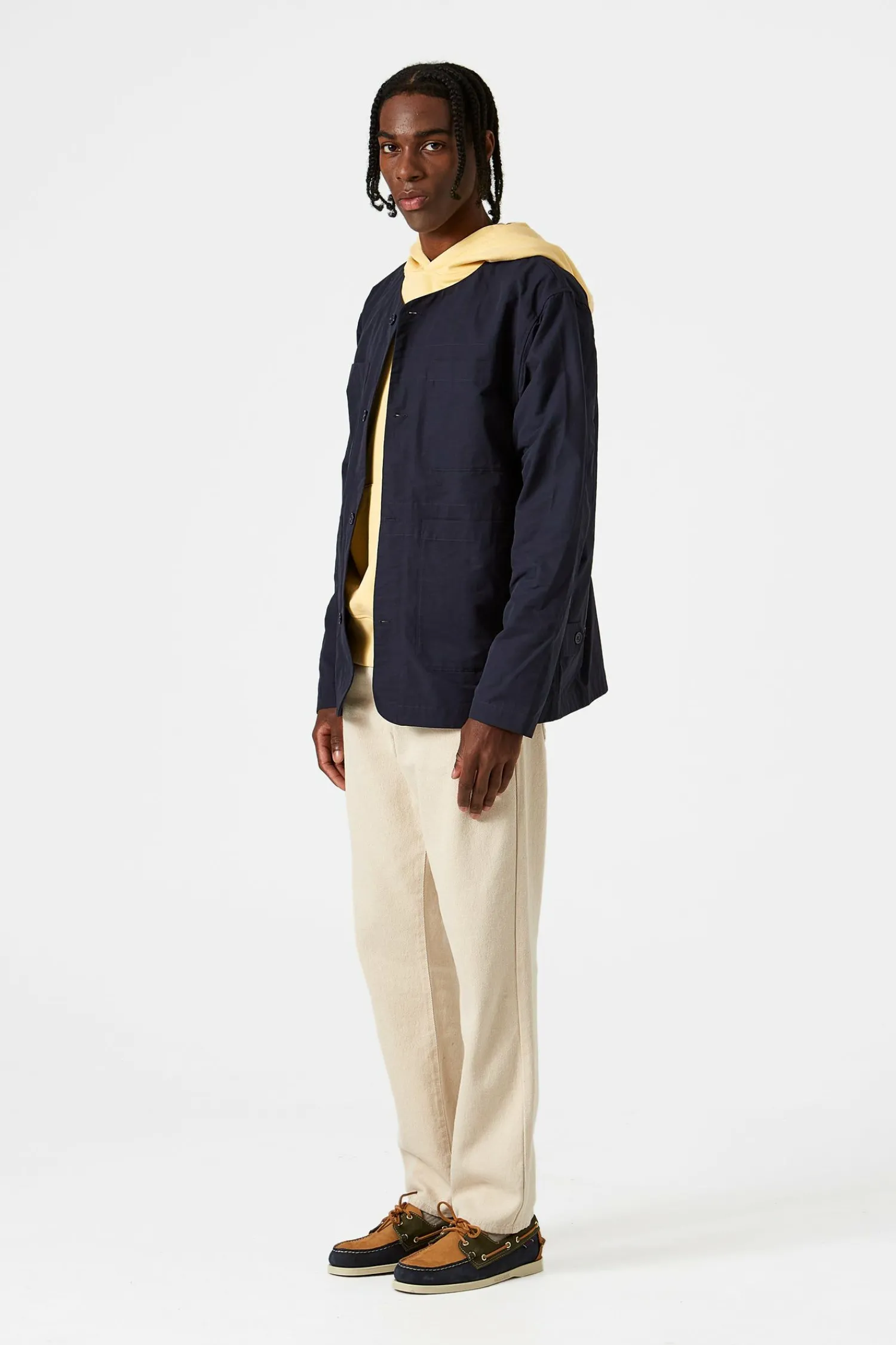 Chaqueta De Corte Recto En Azul Marino Liso. Presenta Dos Grandes Bolsillos. Se Cierra Con Botones.