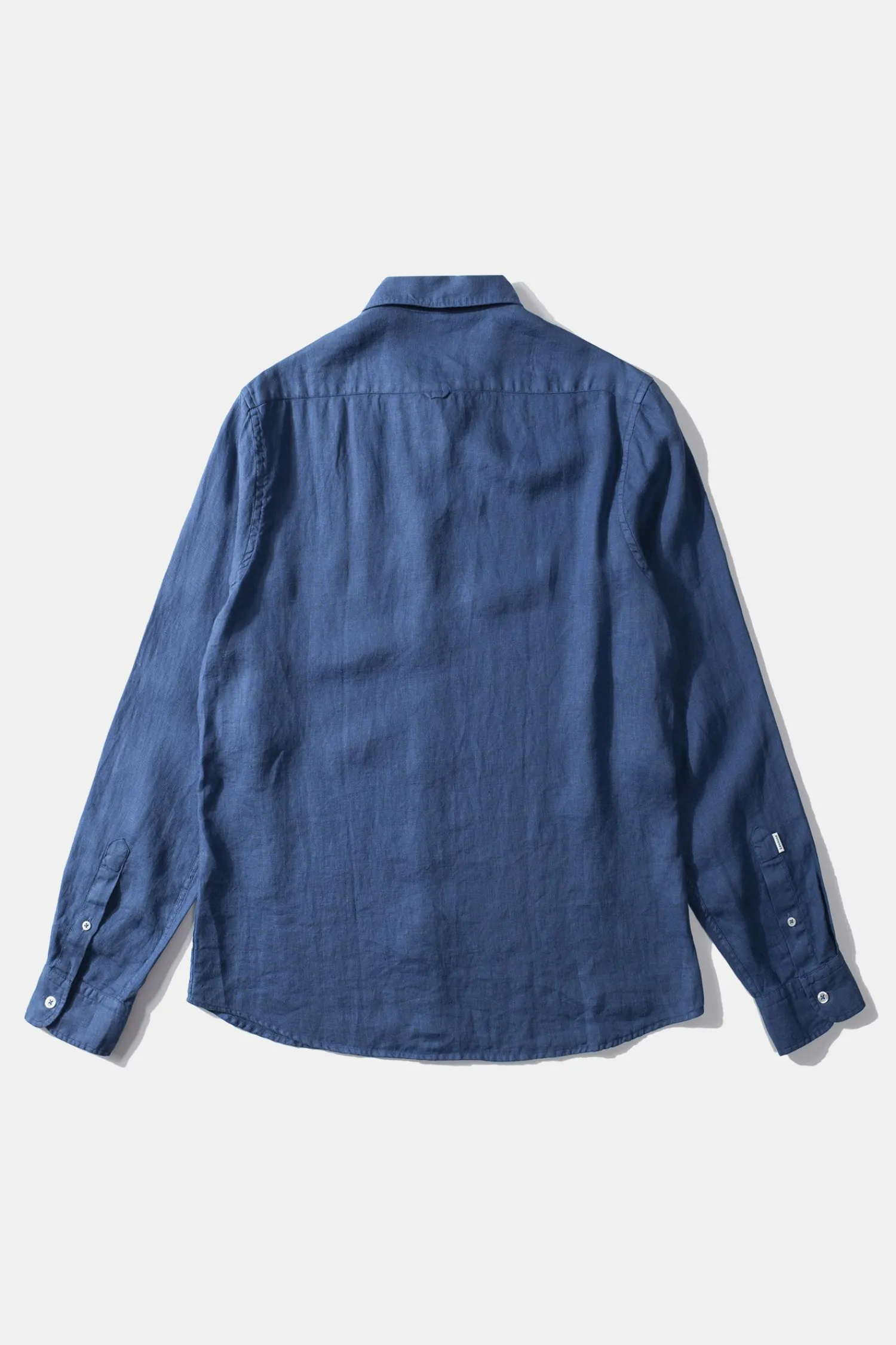 Camisa Azul De Botones. El Cuello De La Prenda Tiene Una Solapa De Pico, Mangas Largas Y Termina En Un Bajo Redondeado. …