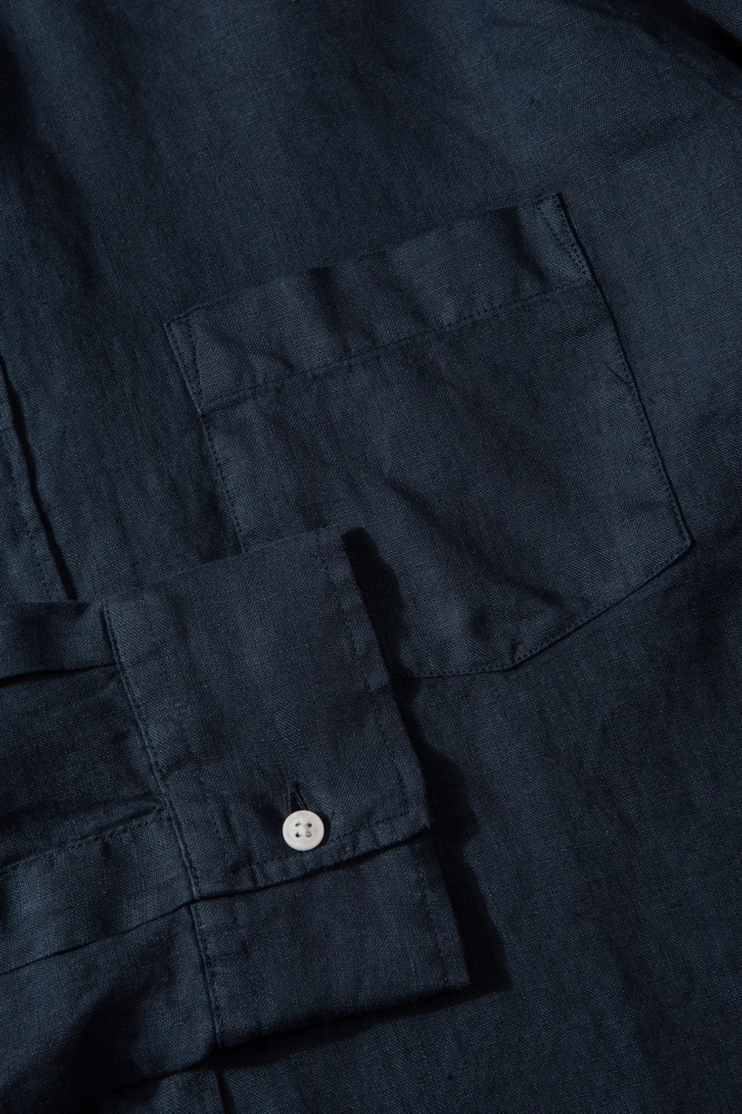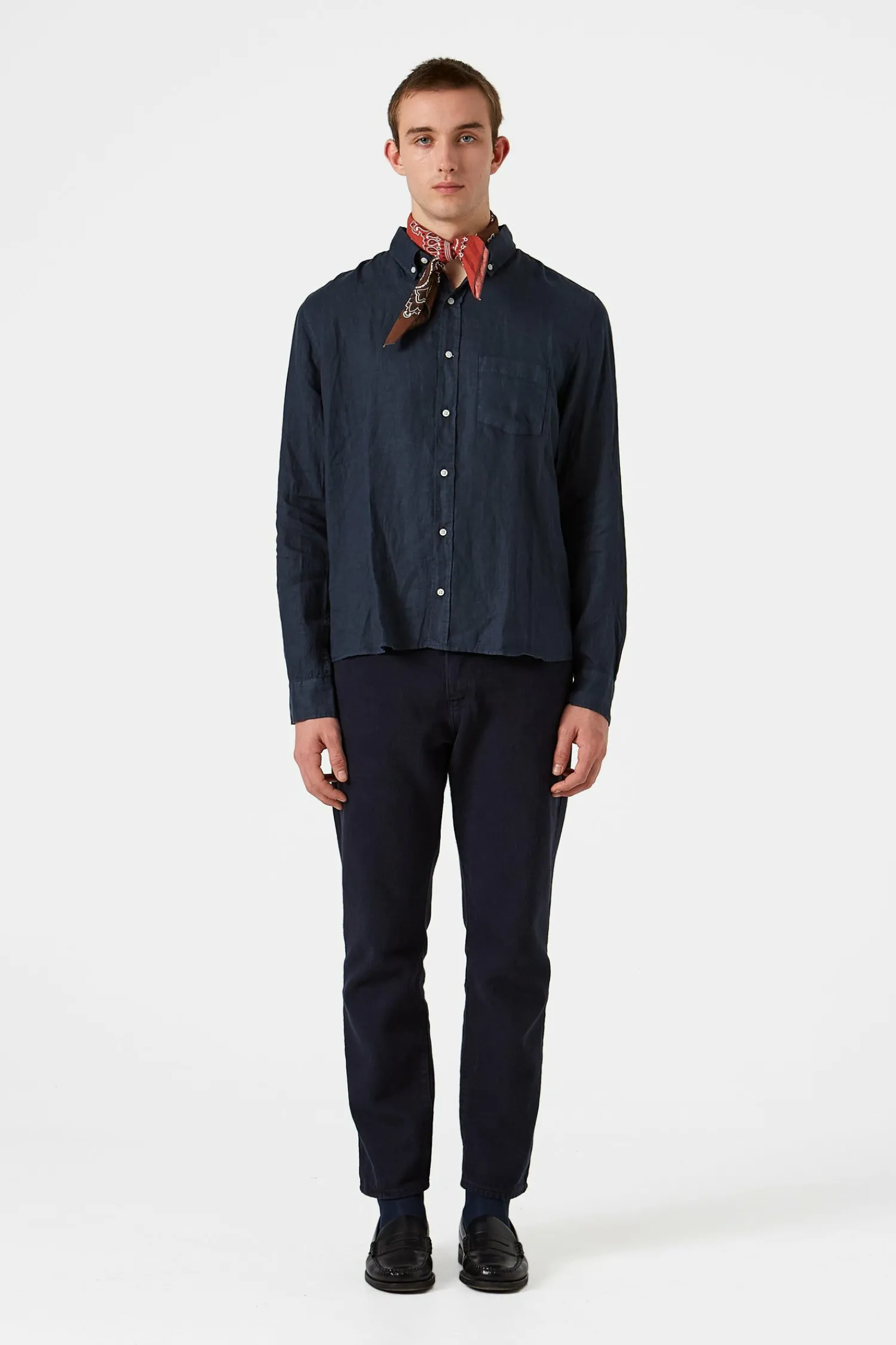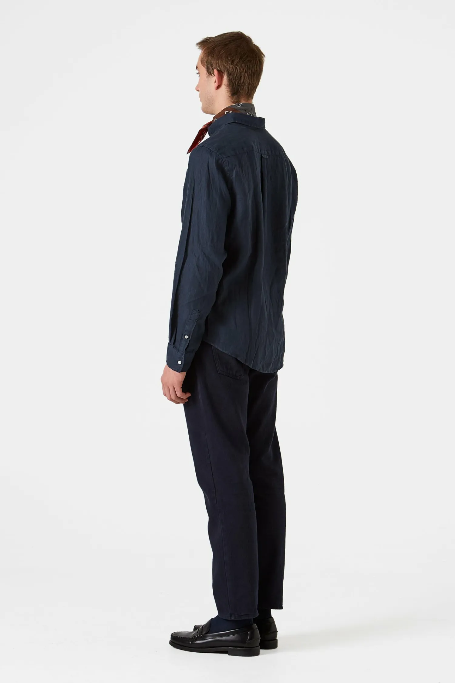 Camisa Lisa Azul Marino Con Botones Fabricada En Portugal. El Cuello De La Prenda Tiene Solapa De Pico, Manga Larga Y Termina En Un Dobladillo Redondeado. Bolsillo En El Lado Izquierdo Del Pecho. Corte Holgado.