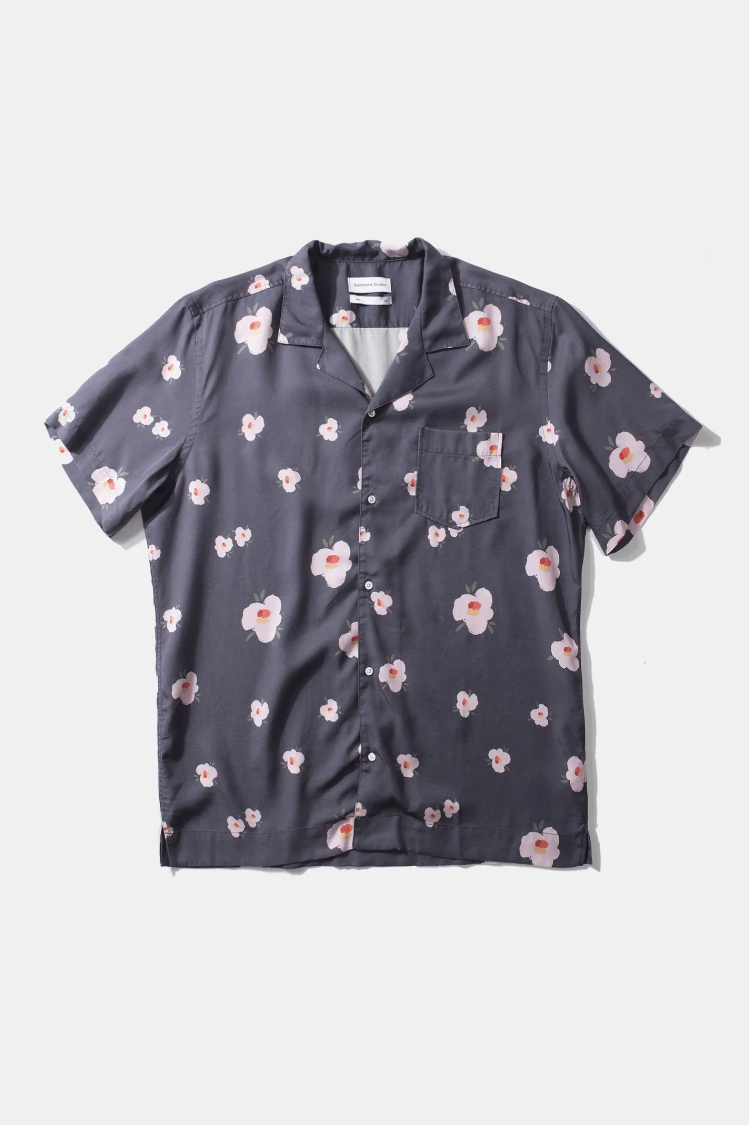 Camisa De Manga Corta Y Corte Recto. Estampado De Orquideas, Cierre Con Botones Y Tiene Cuello Abierto. Tambien Tiene Un Bolsillo En El Lado Izquierdo Del Pecho.