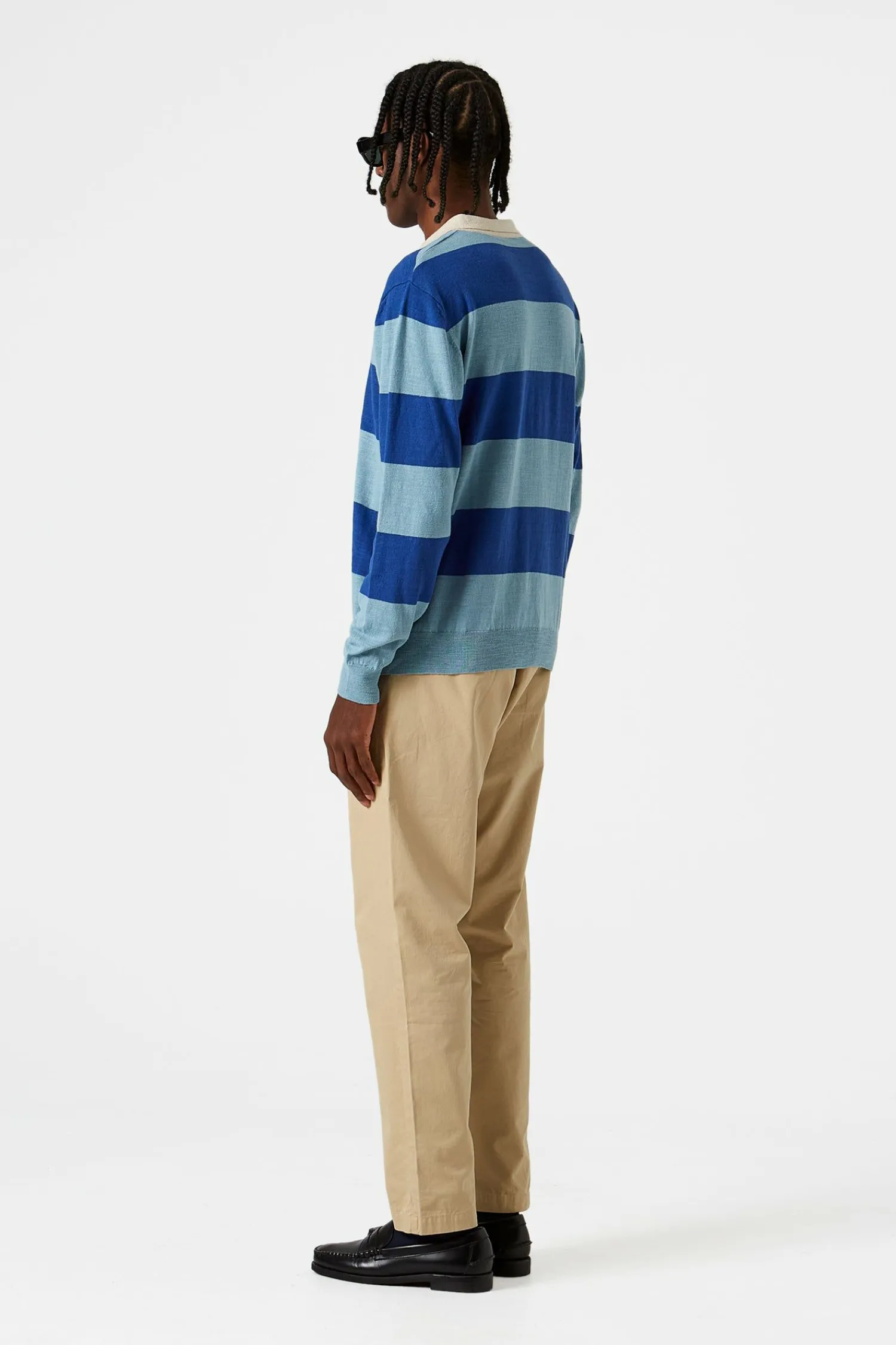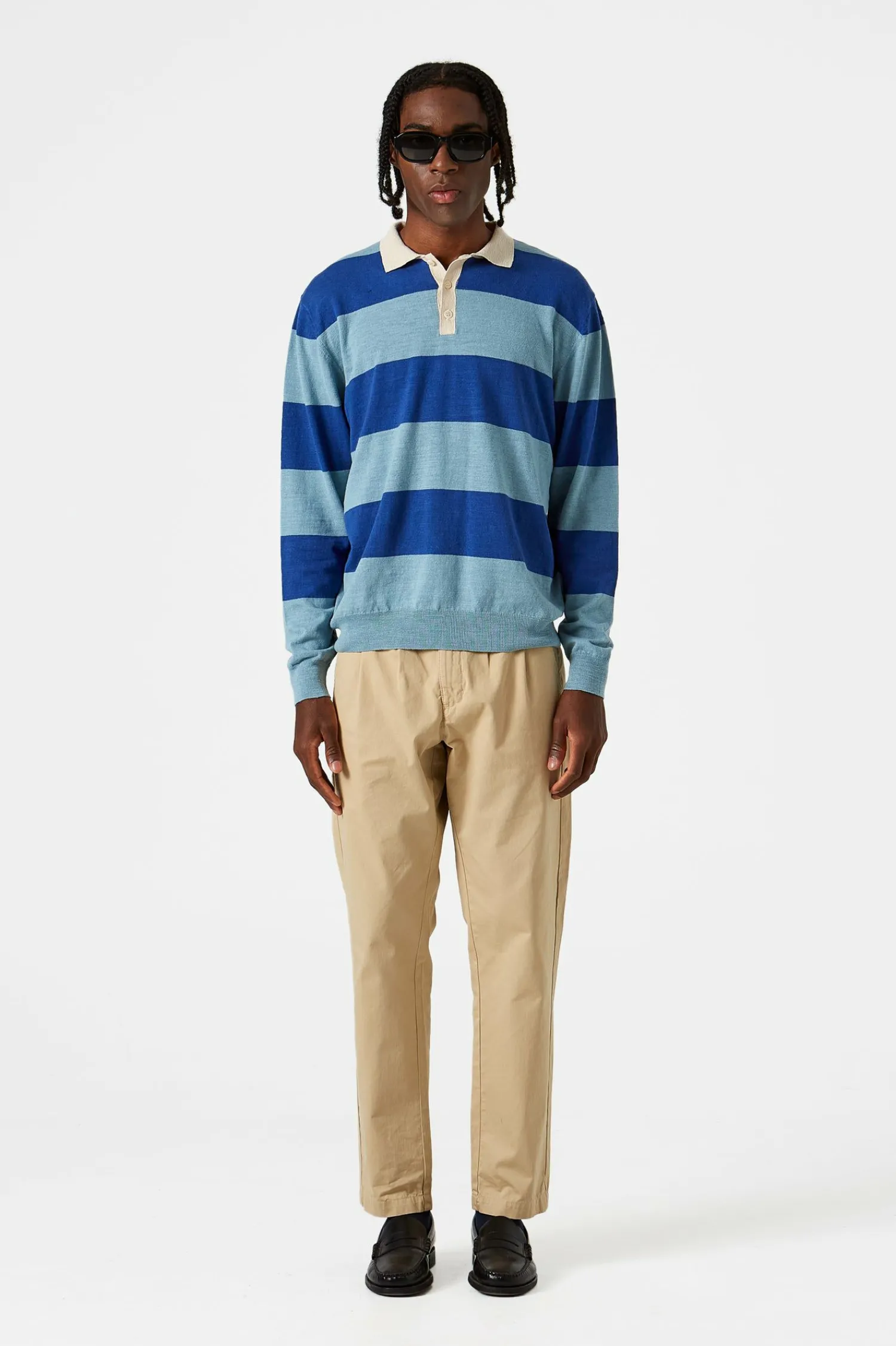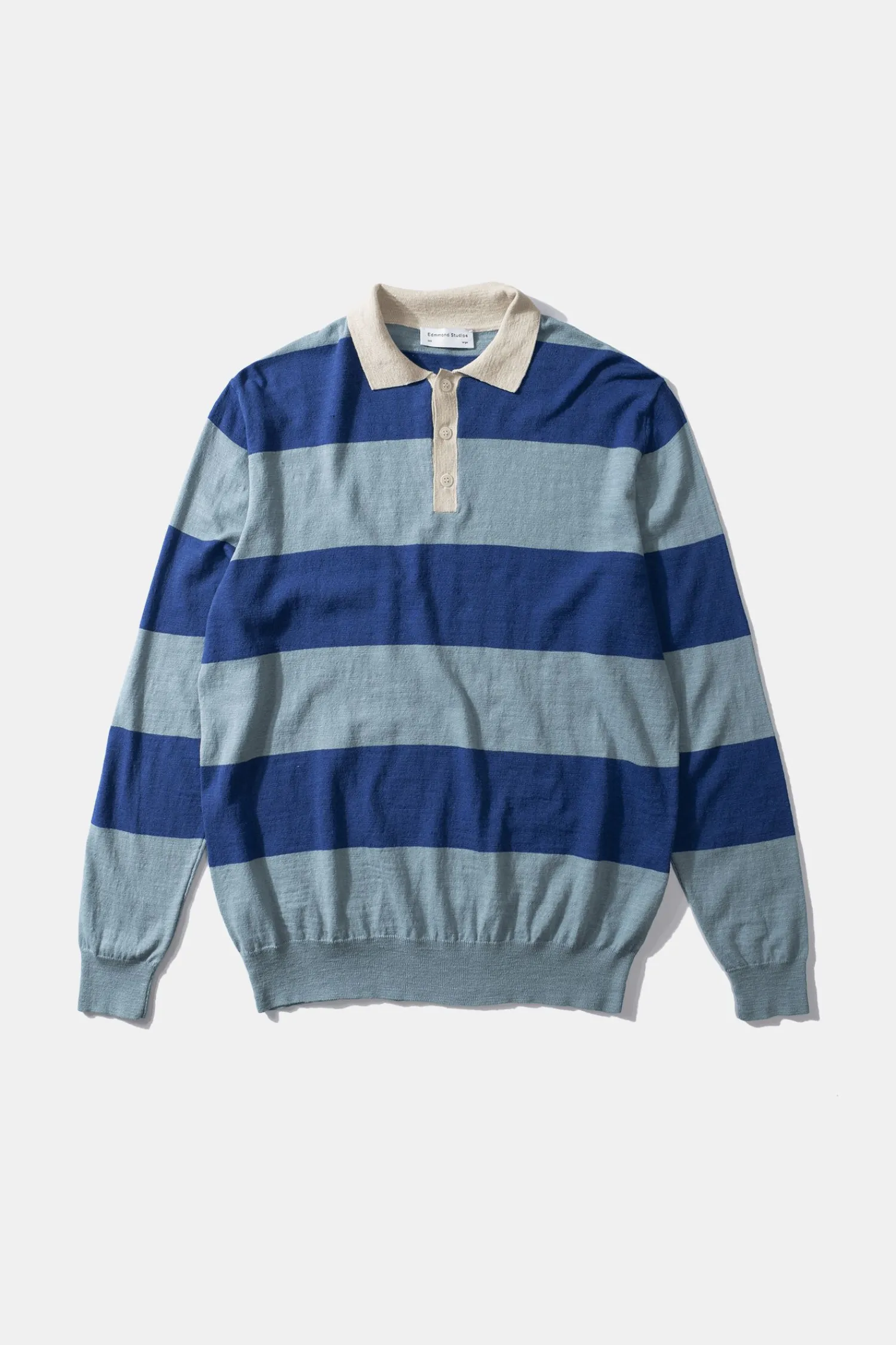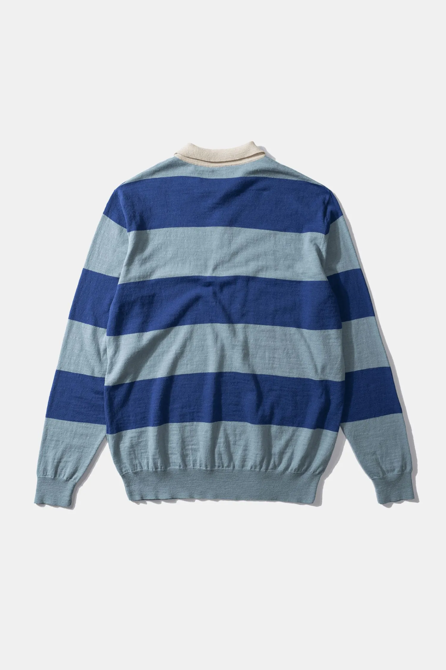 Polo De Punto Estilo Rugby Con Mangas Largas Y Cuello Camisero Abotonado. Presenta Tres Botones Bajo El Cuello, Un Diseno De Rayas Azules Y Suave Y El Bajo Y Los Punos De Las Mangas En Un Tejido Acanalado.