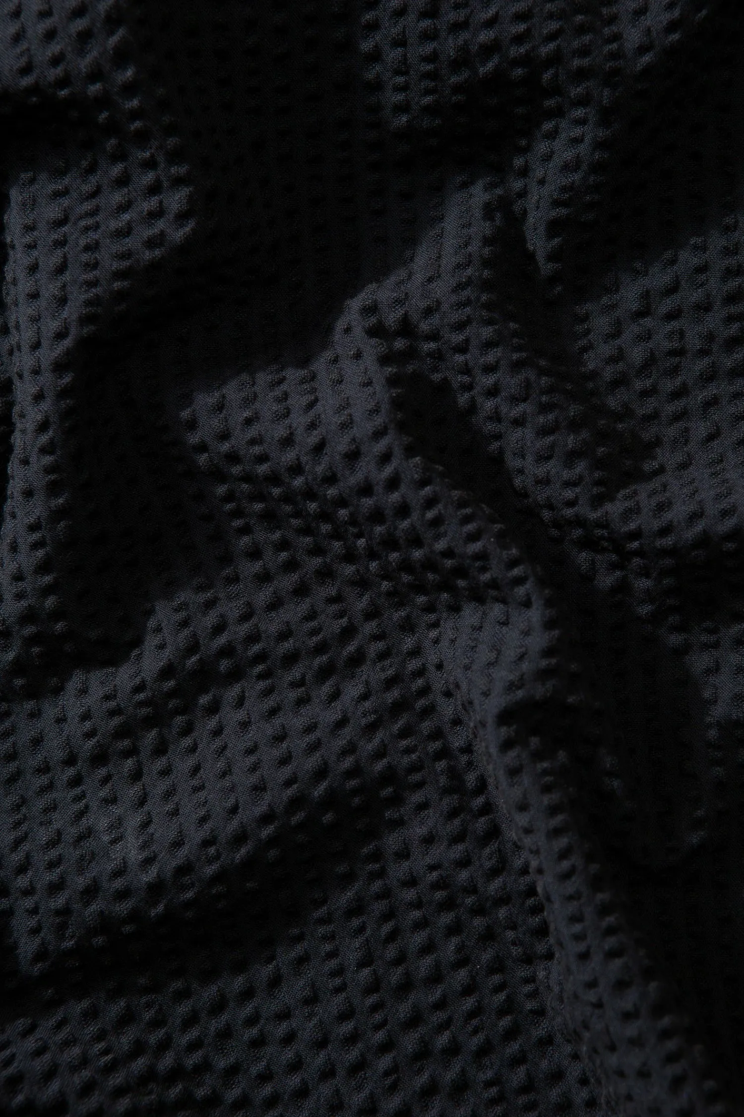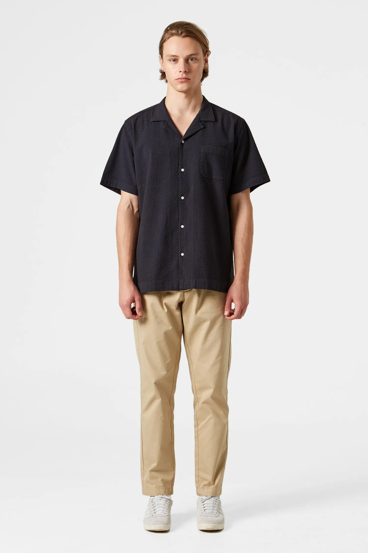 Camisa Seersucker En Azul Marino. Con Mangas Cortas, Cierre De Botones En La Parte Delantera Y Diseno De Cuello Corto Con Solapas En Punta.