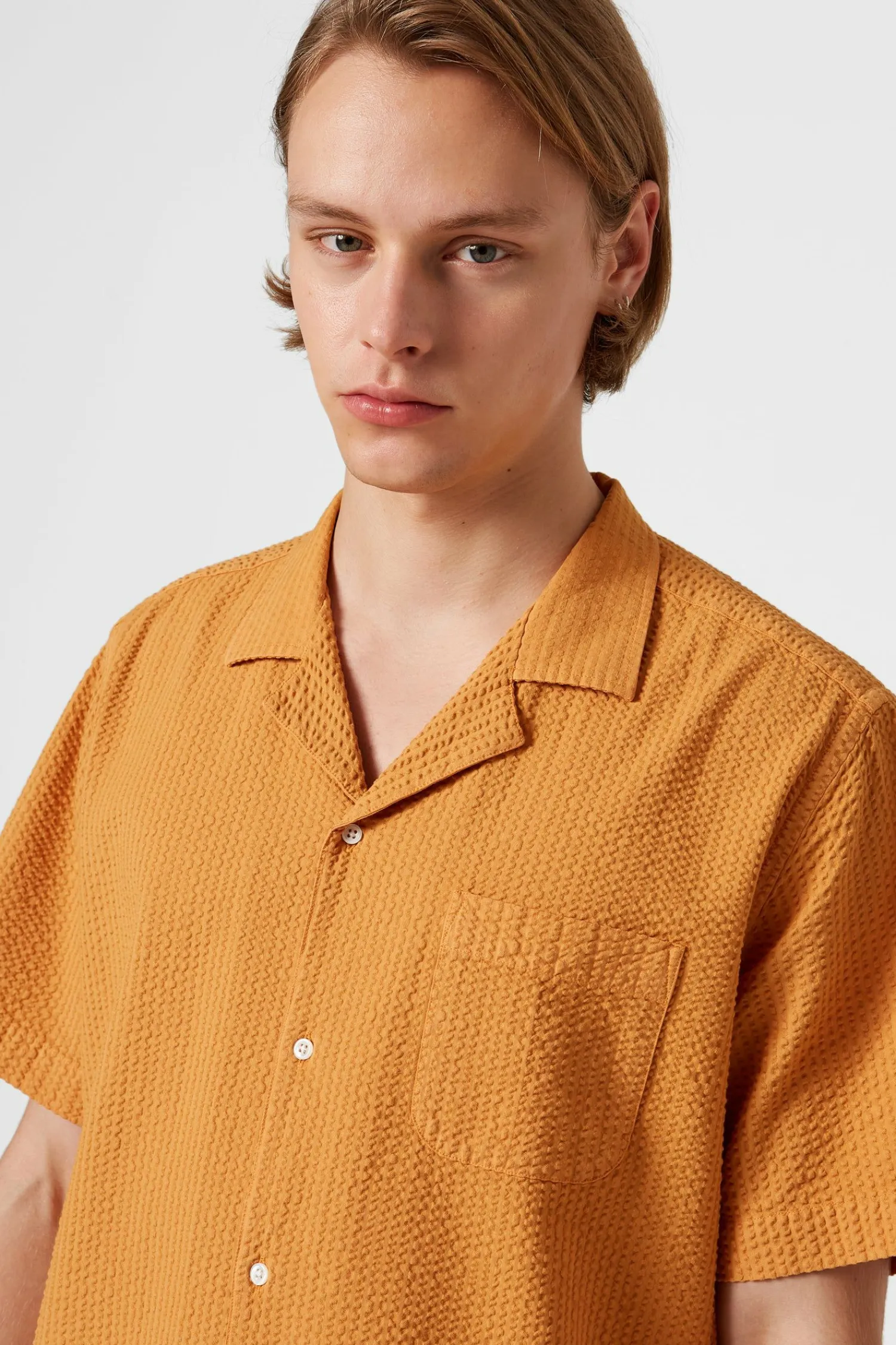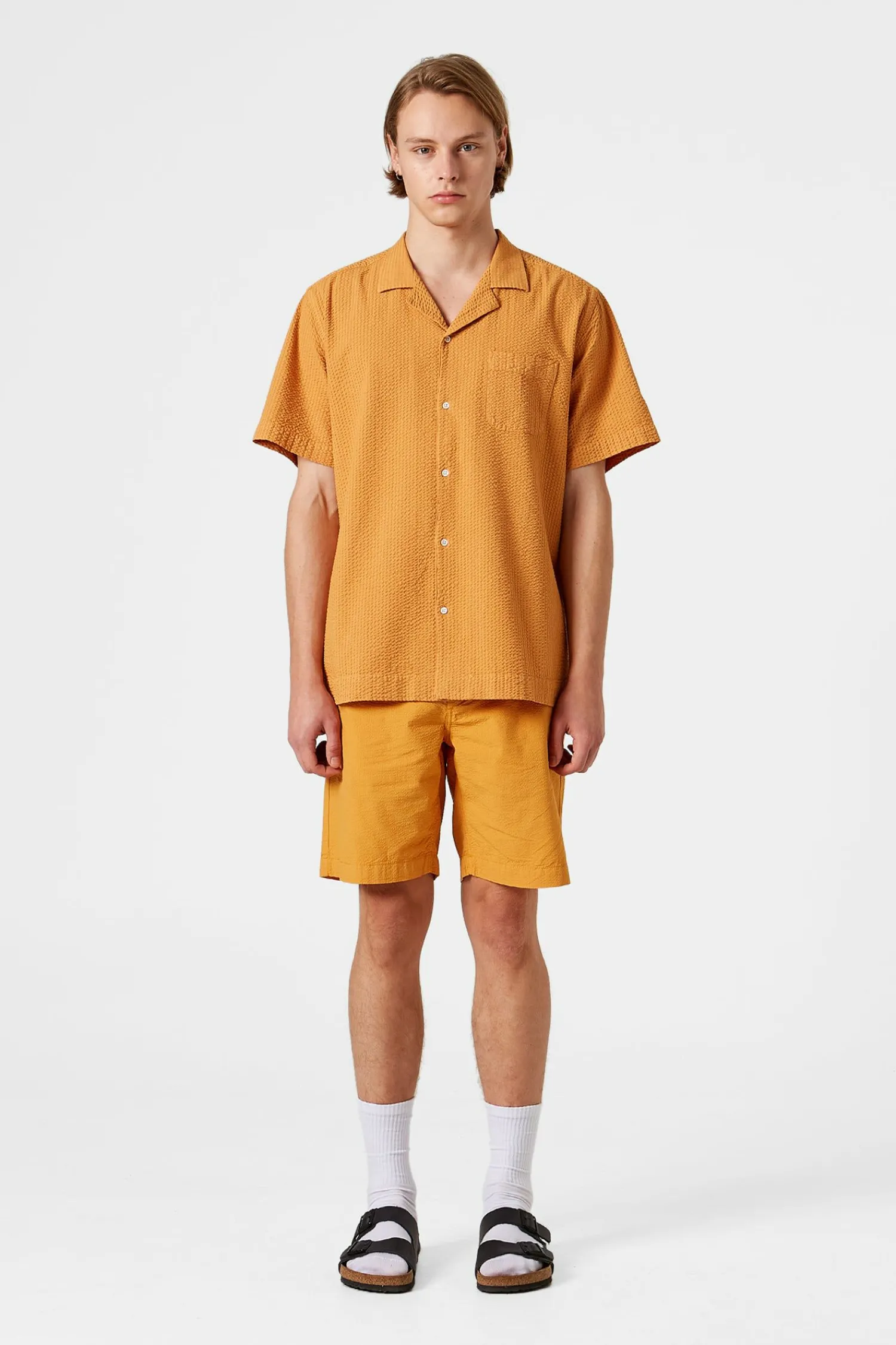 Pantalon Corto De Tejido Seersucker En Color Mostaza Fabricado En Portugal. Con Cierre De Boton En La Cintura Y Con Sus Respectivas Hebillas Para Correa.