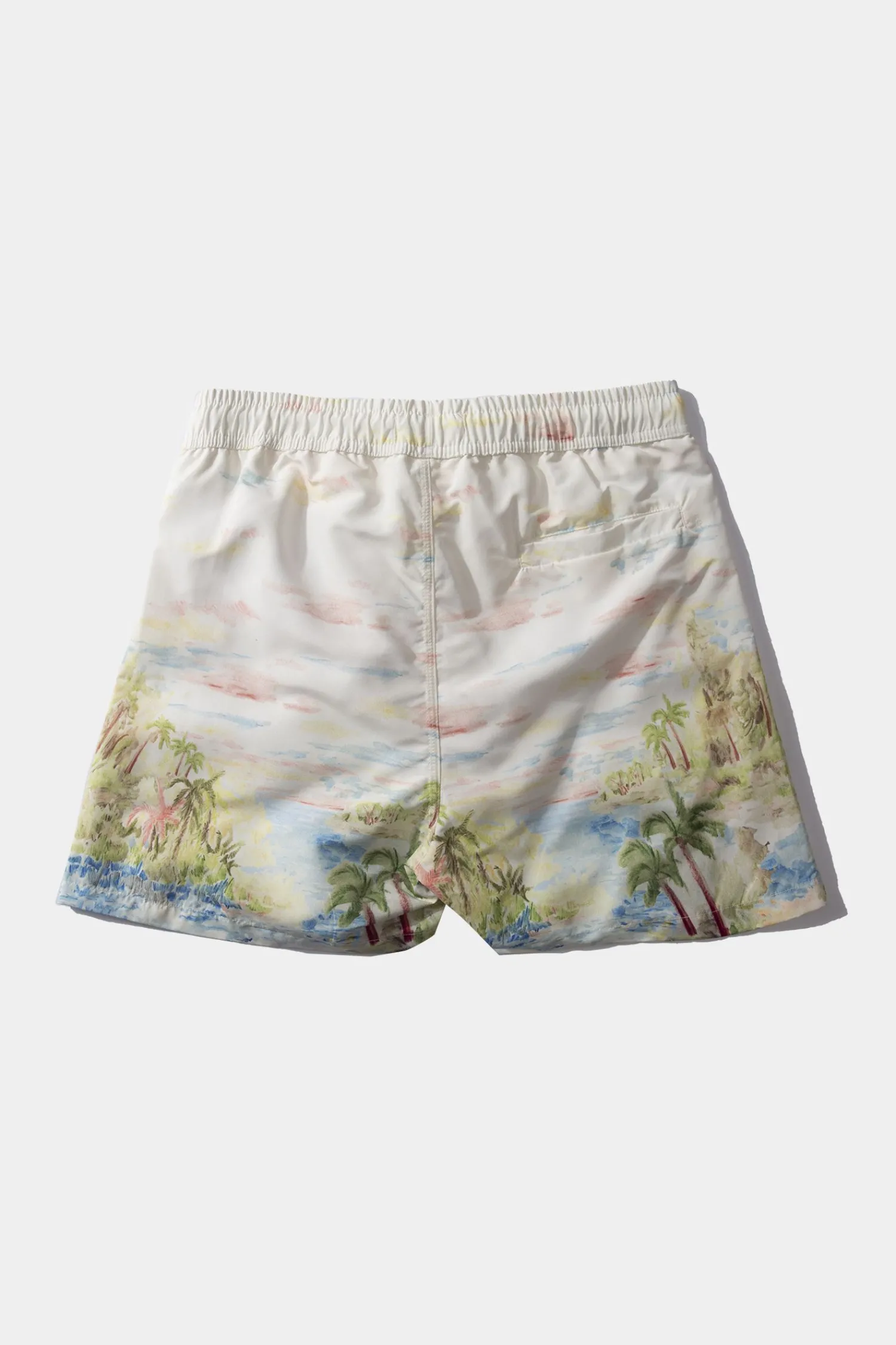 Banador De Color Blanco Crudo Con Estampado Summer Classic, Cintura Elastica Y Cordon Ajustable. El Estampado Ha Sido Di…