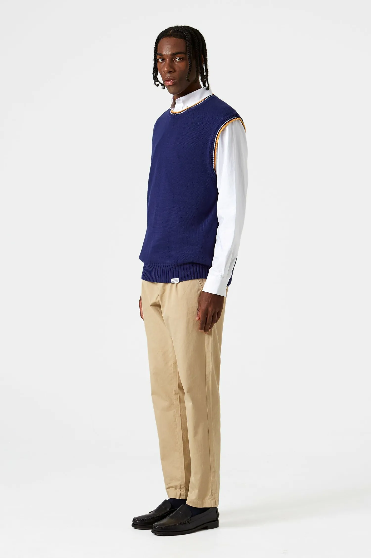 Chaleco De Algodon En Color Azul Marino.Presenta Un Bajo Con Tejido Canale Y Cuello Con Detalles En Color Naranja Y Blanco. En La Parte Inferior Tiene Etiqueta De Edmmond.