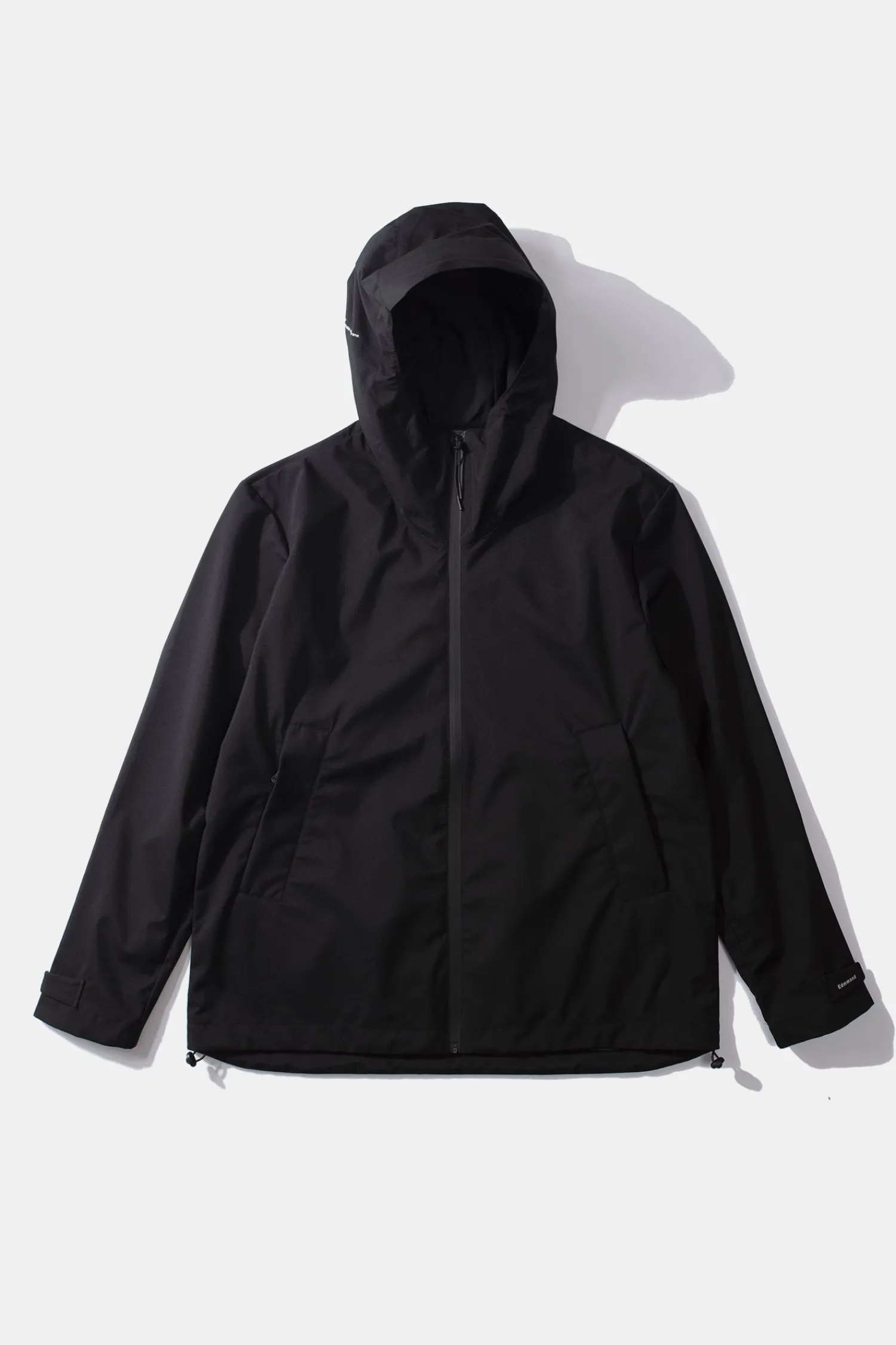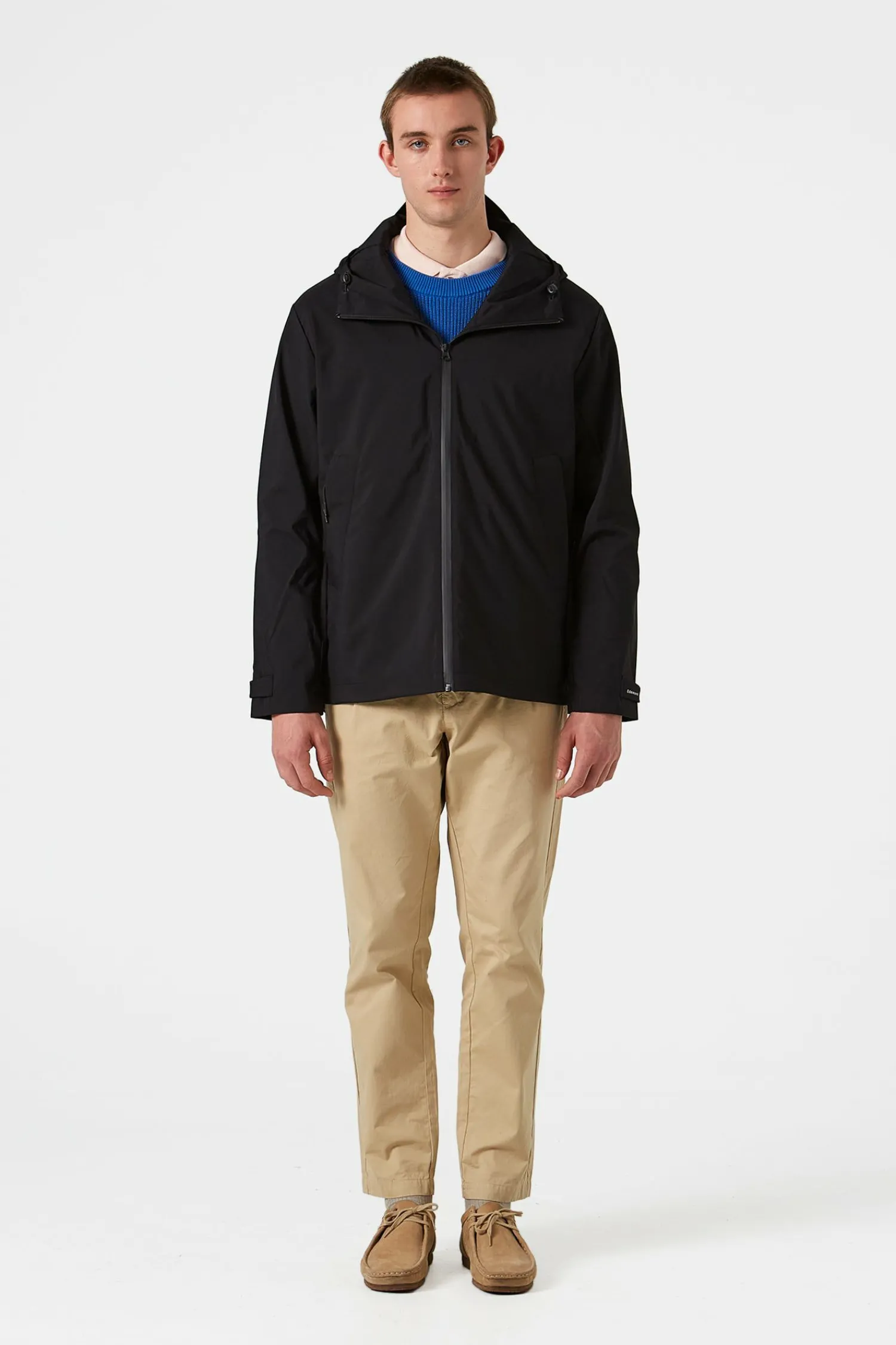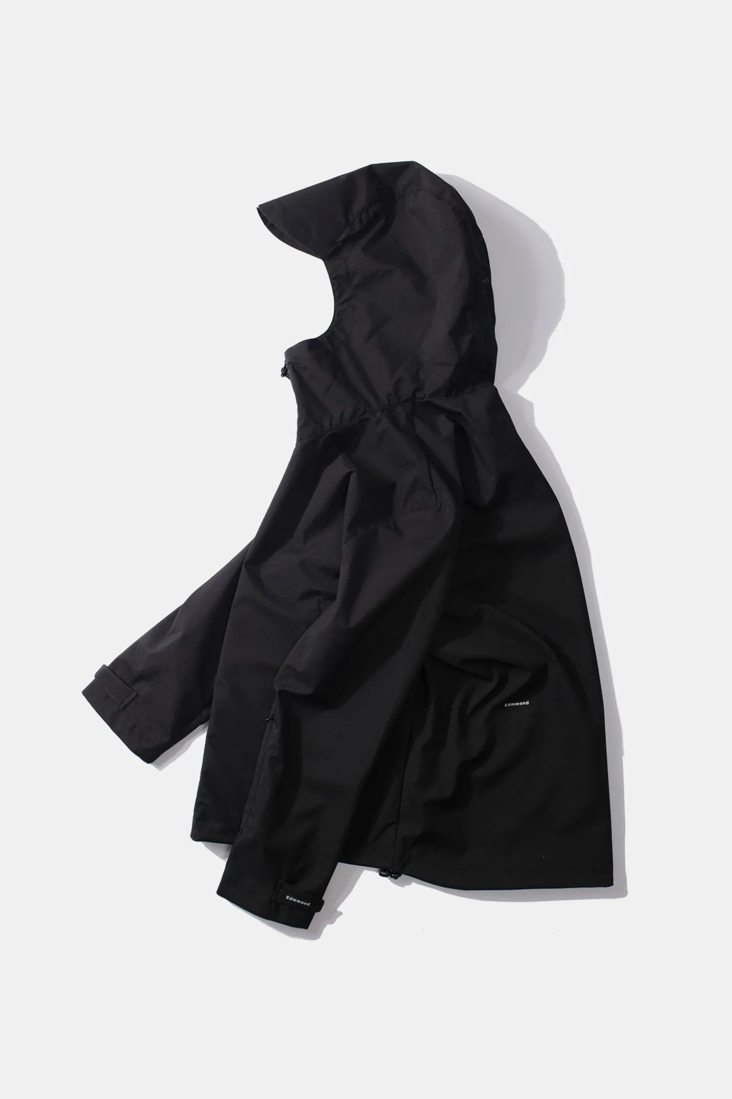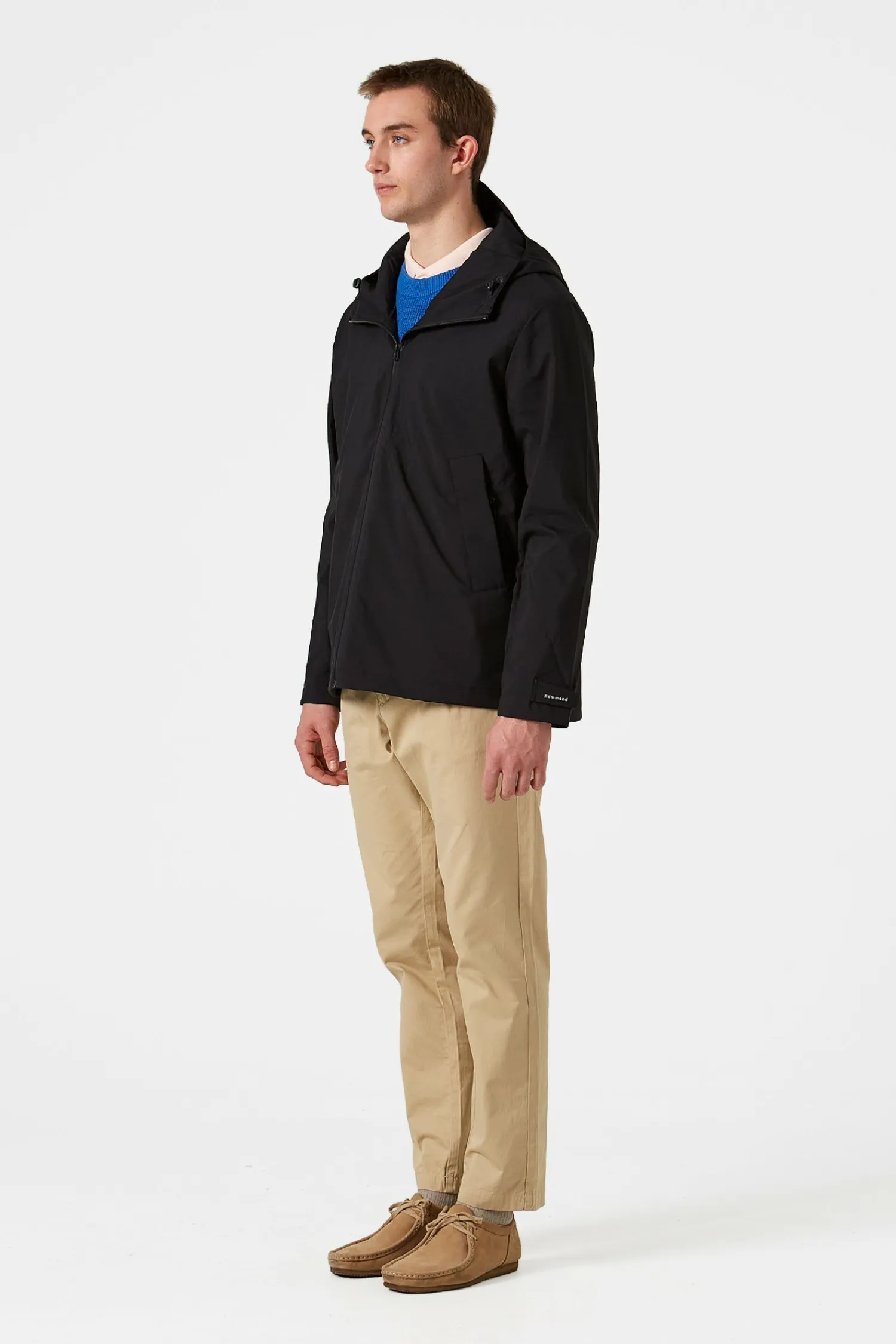Chaqueta De Color Negro. Capucha Ajustable Y Mangas Con Velcro. Tiene Bolsillos Exteriores Orientados En Diagonal.