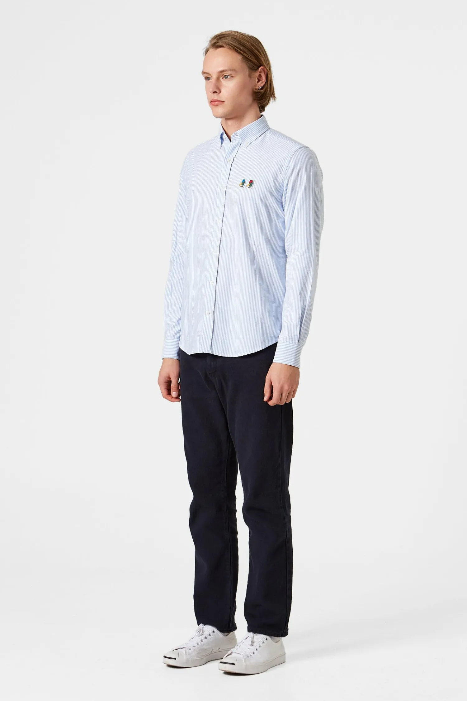 Camisa Abotonada De Rayas Verticales En Azul Claro. Se Completa Con El Logotipo De La Cabeza De Pato Bordado En El Pecho.