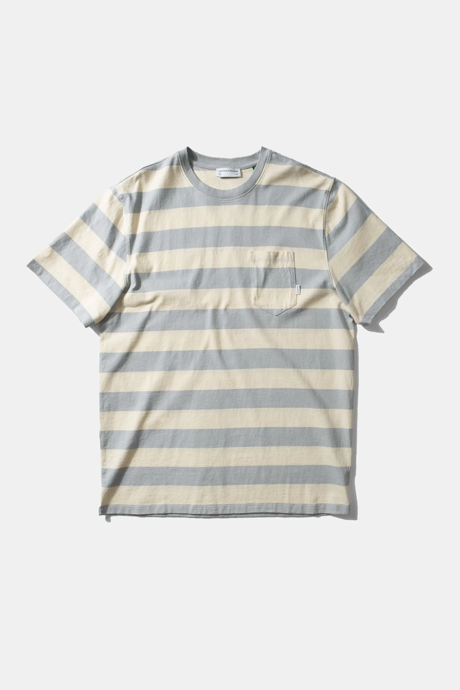 Camiseta De Manga Corta. Rayas Azules Y Gris Liso. Bolsillo En El Lado Izquierdo Del Pecho.