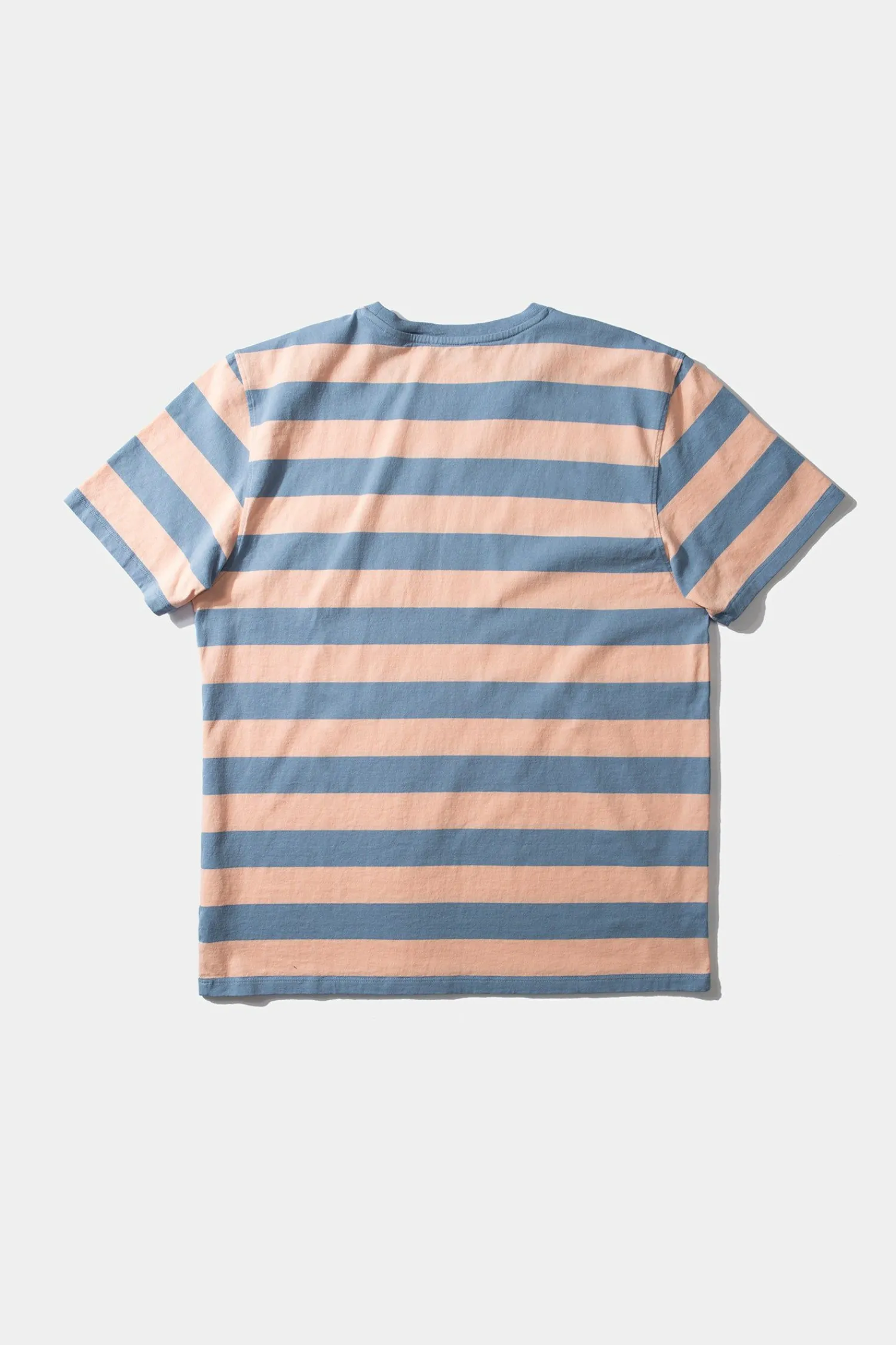 Camiseta De Manga Corta. Rayas Color Salmon Y Azul Acero. Bolsillo En El Lado Izquierdo Del Pecho.