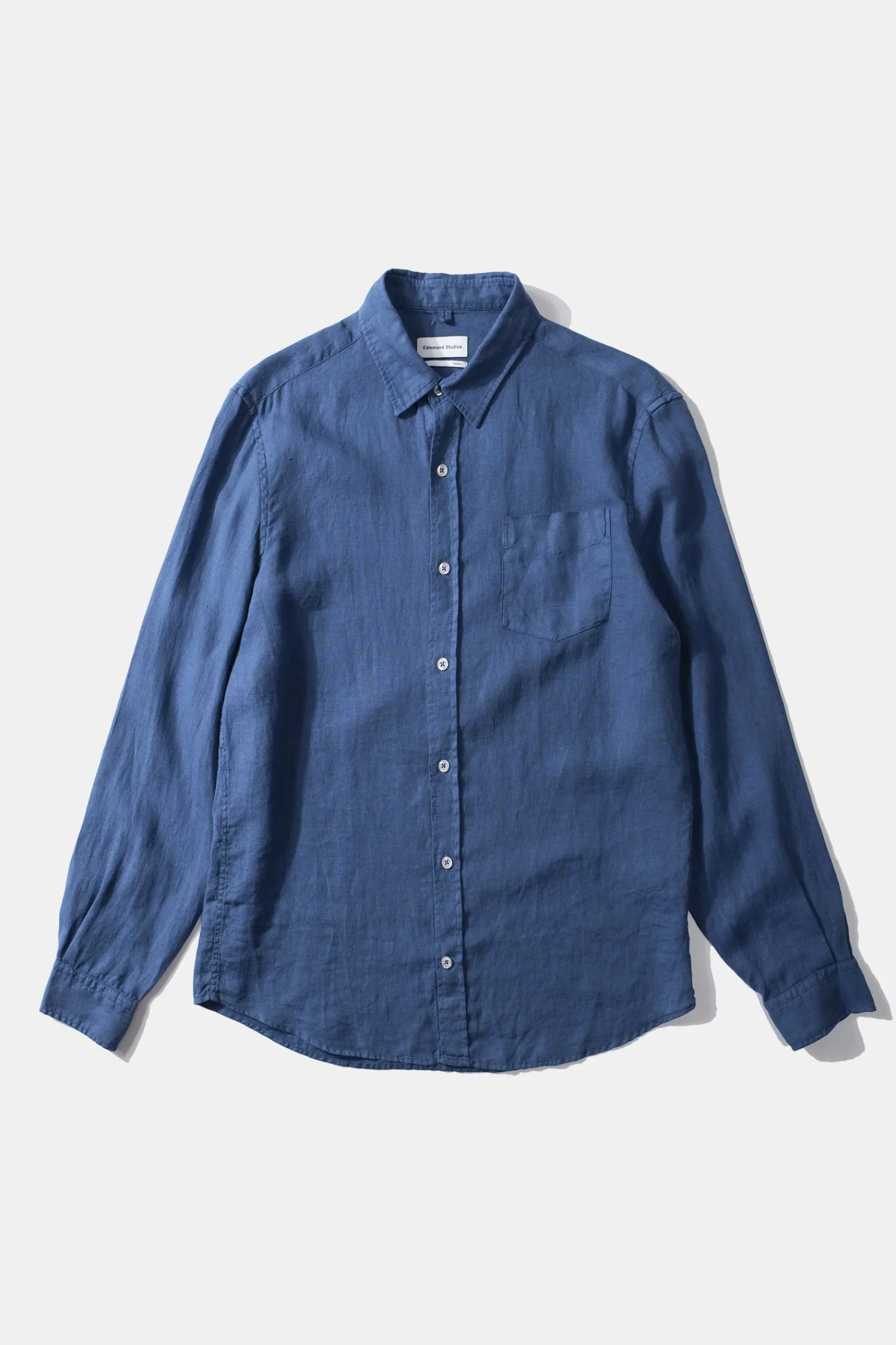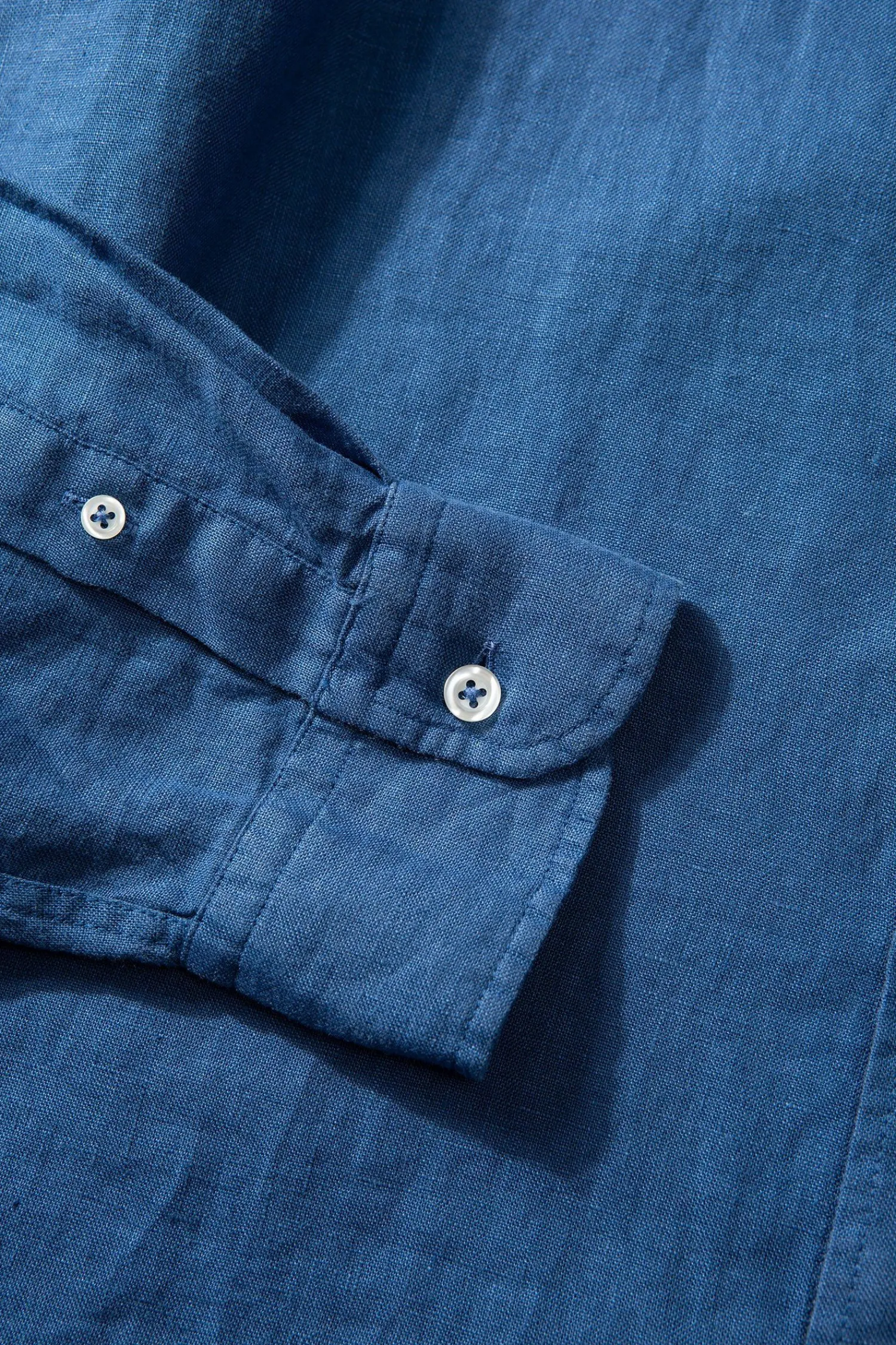 Camisa Azul De Botones. El Cuello De La Prenda Tiene Una Solapa De Pico, Mangas Largas Y Termina En Un Bajo Redondeado. …