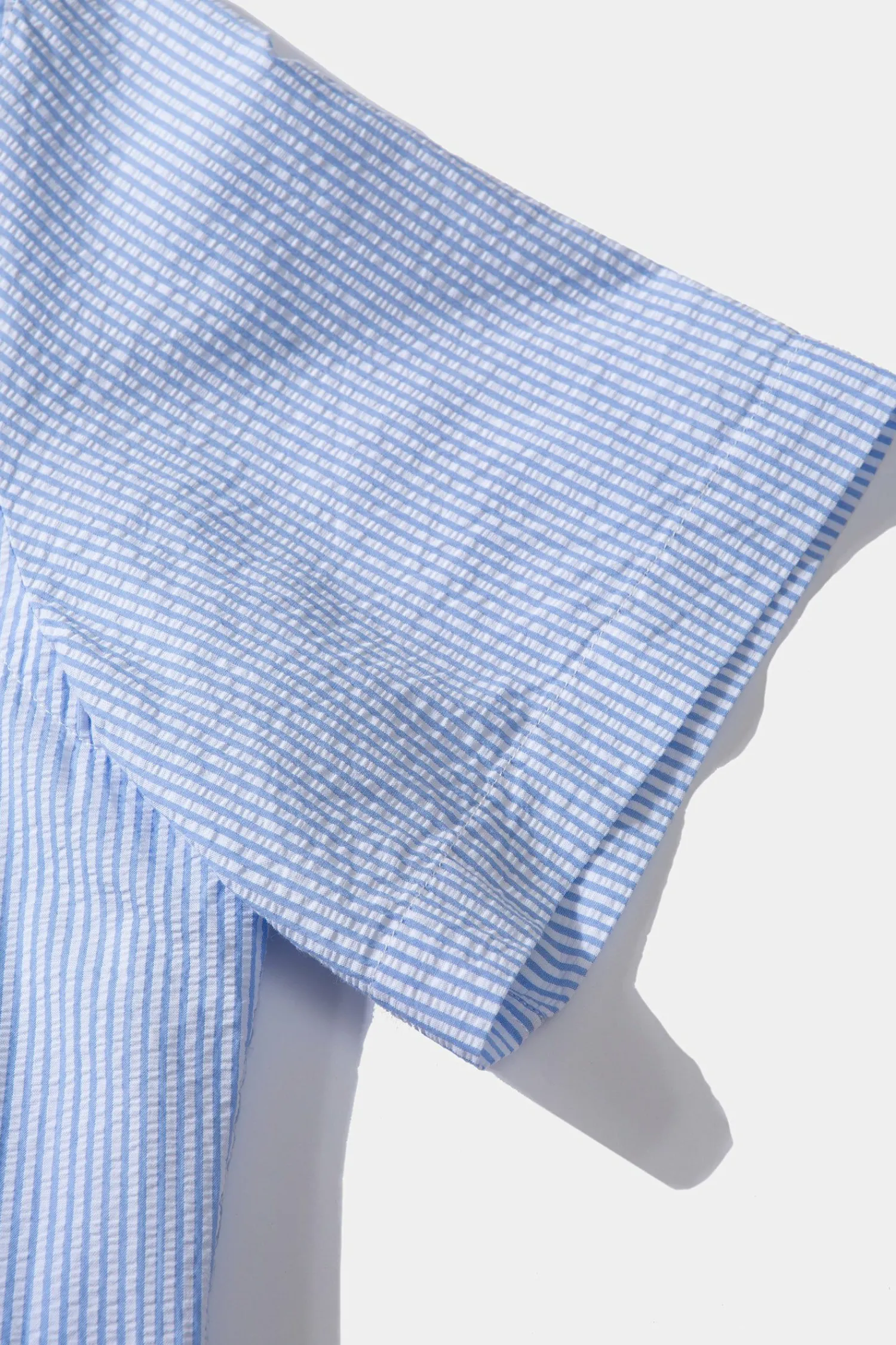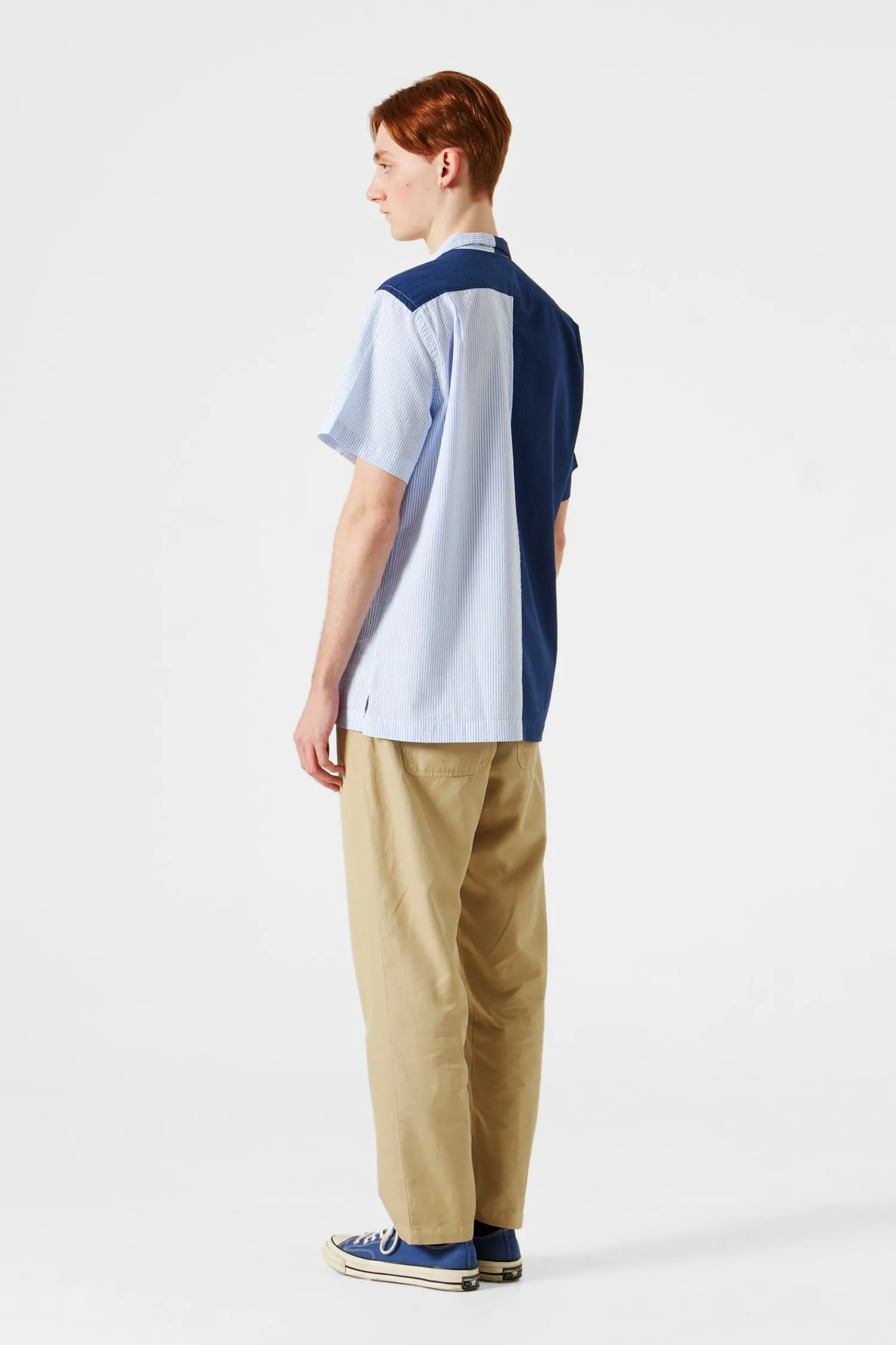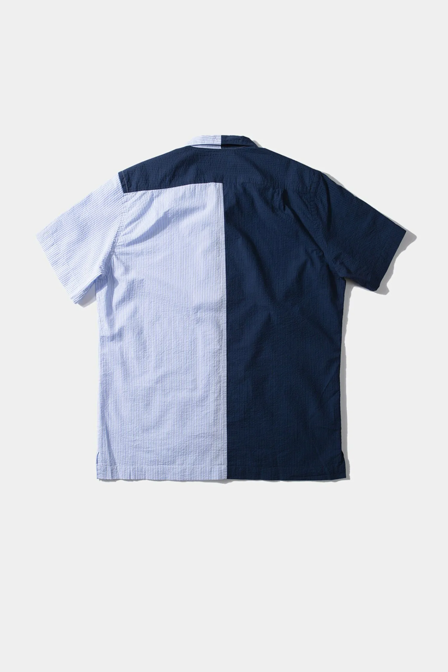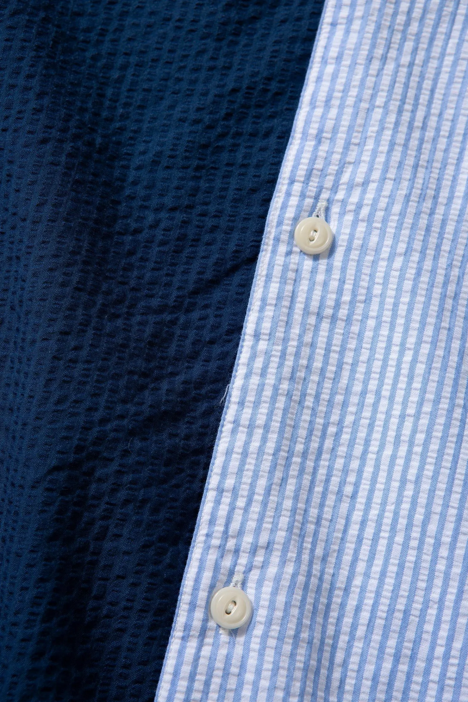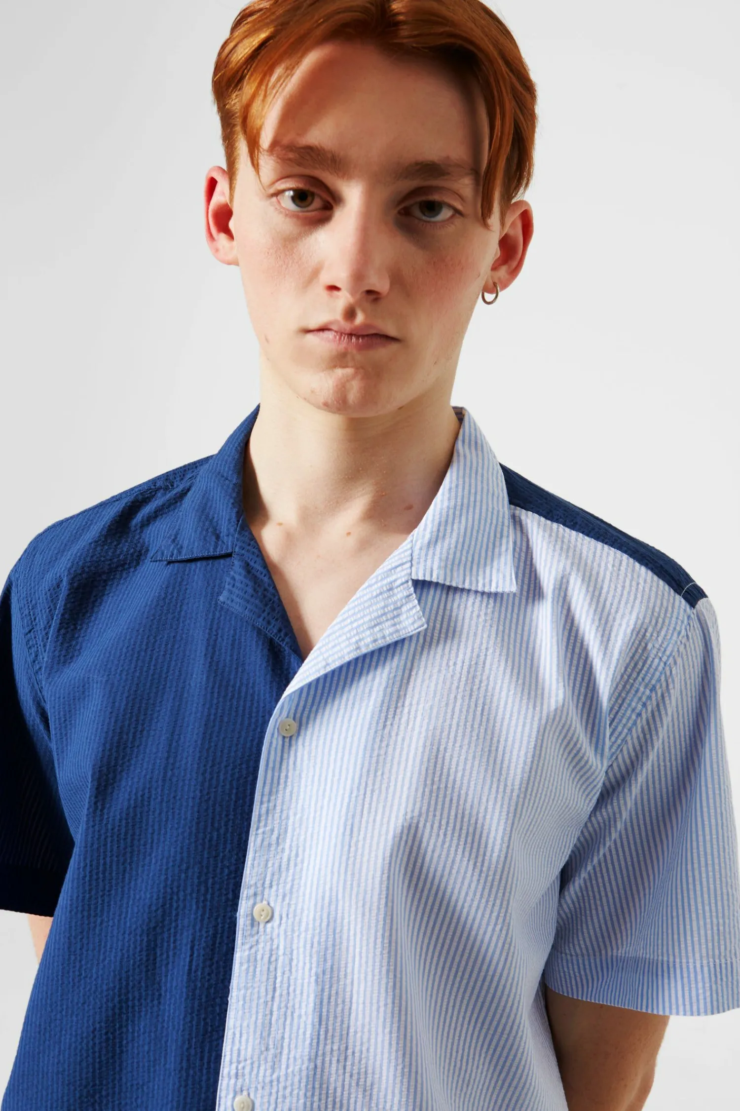 Esta Camisa Viene En Color Azul Marino Y Azul Claro, De Mangas Cortas Y El Corte De Colores Justo En La Separacion De Los Botones.