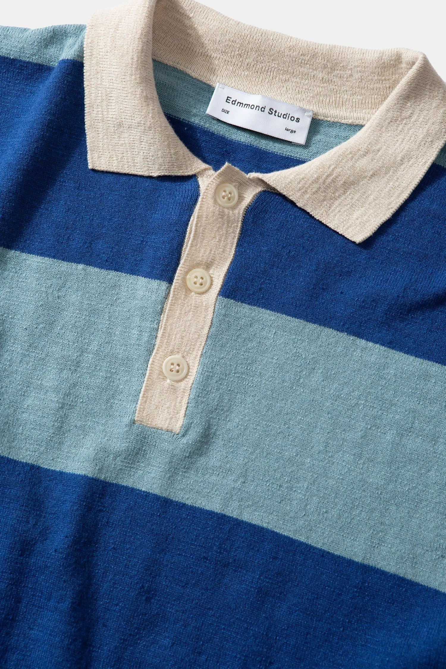 Polo De Punto Estilo Rugby Con Mangas Largas Y Cuello Camisero Abotonado. Presenta Tres Botones Bajo El Cuello, Un Diseno De Rayas Azules Y Suave Y El Bajo Y Los Punos De Las Mangas En Un Tejido Acanalado.