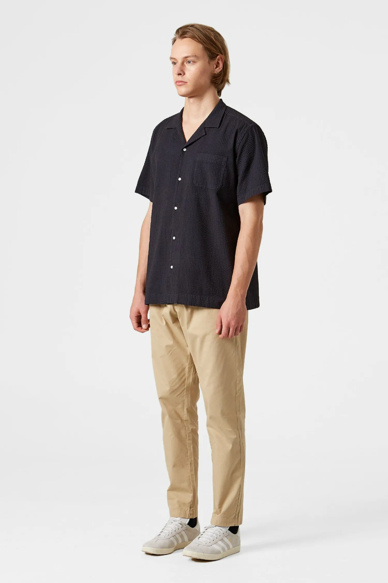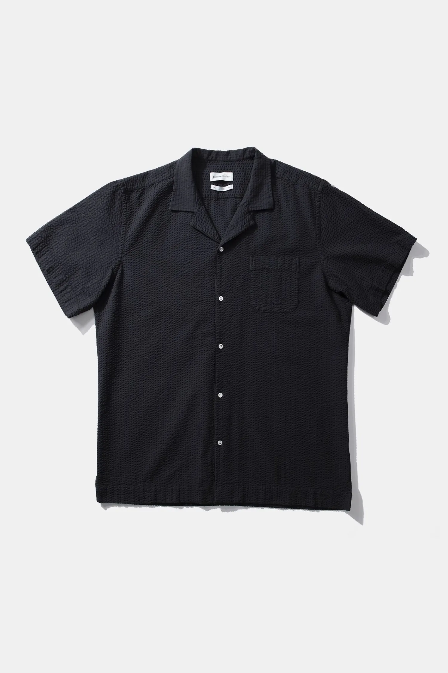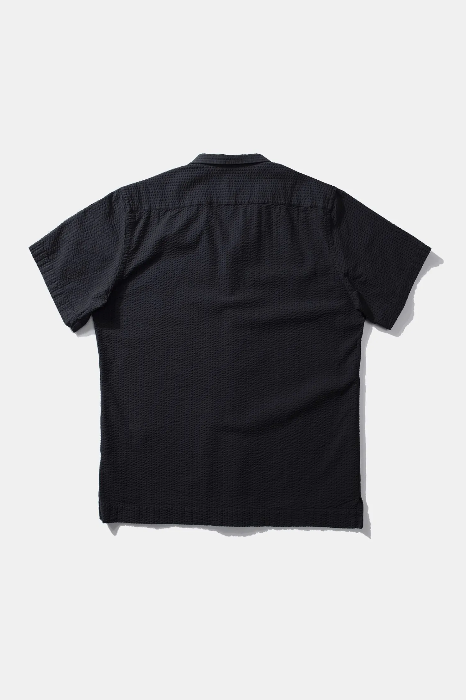 Camisa Seersucker En Azul Marino. Con Mangas Cortas, Cierre De Botones En La Parte Delantera Y Diseno De Cuello Corto Con Solapas En Punta.