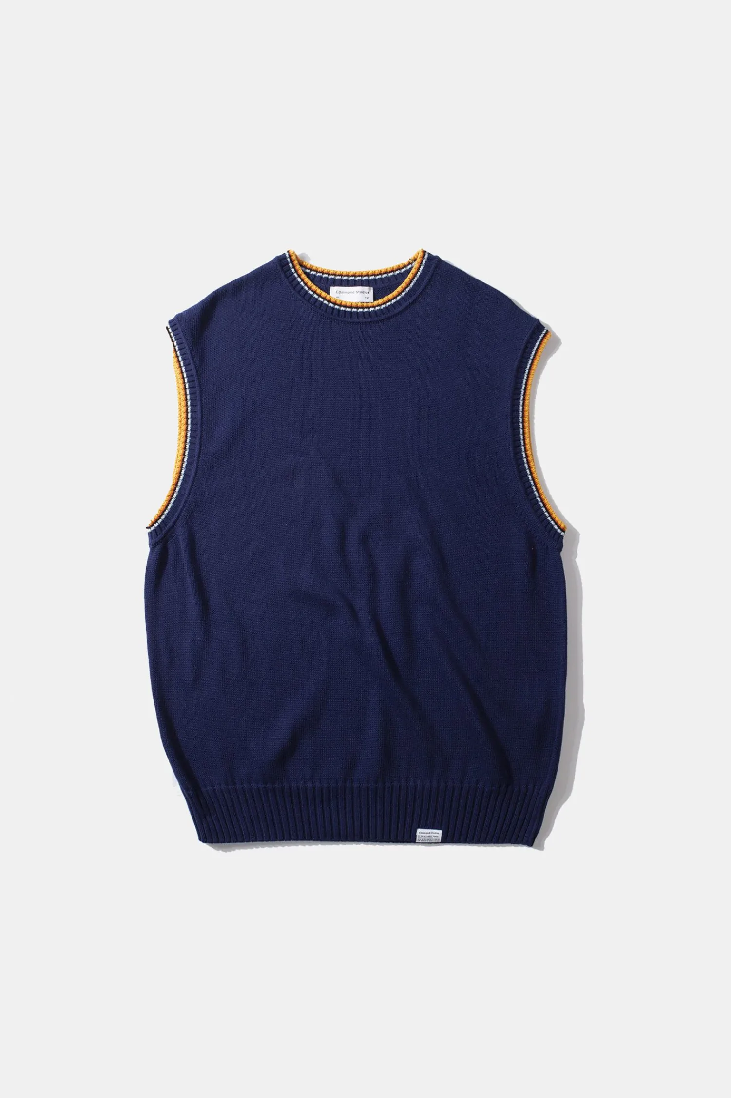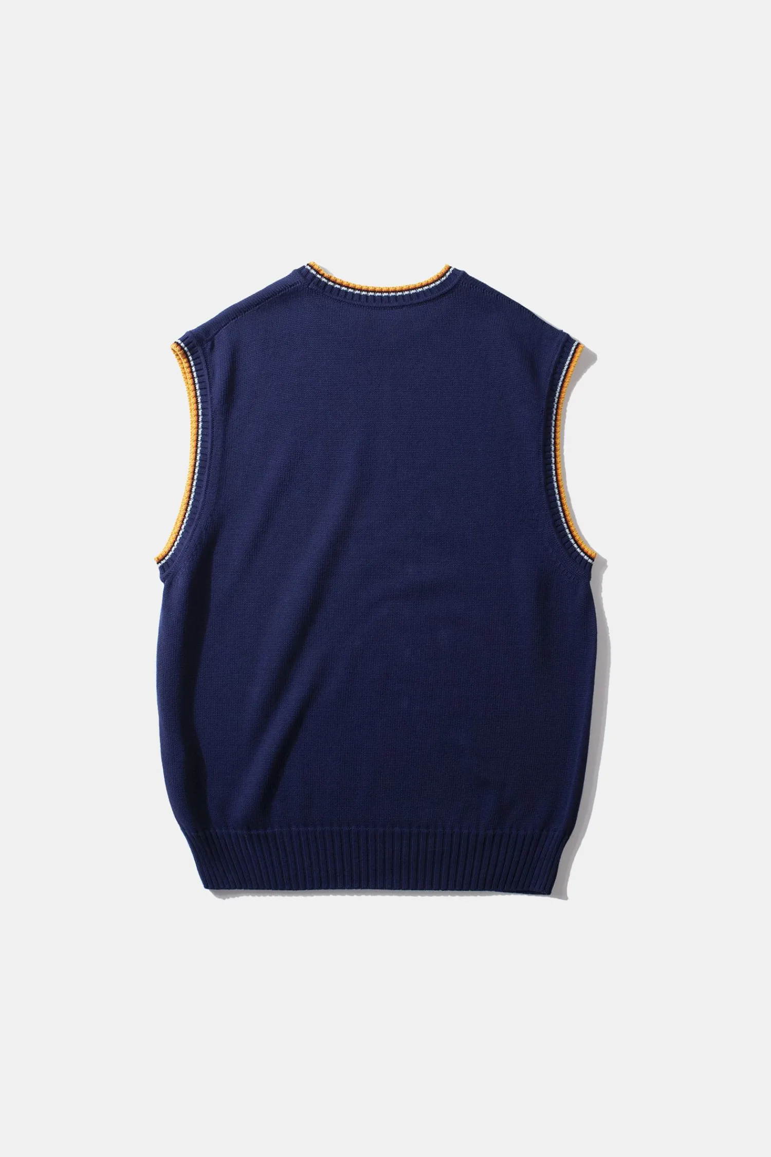 Chaleco De Algodon En Color Azul Marino.Presenta Un Bajo Con Tejido Canale Y Cuello Con Detalles En Color Naranja Y Blanco. En La Parte Inferior Tiene Etiqueta De Edmmond.