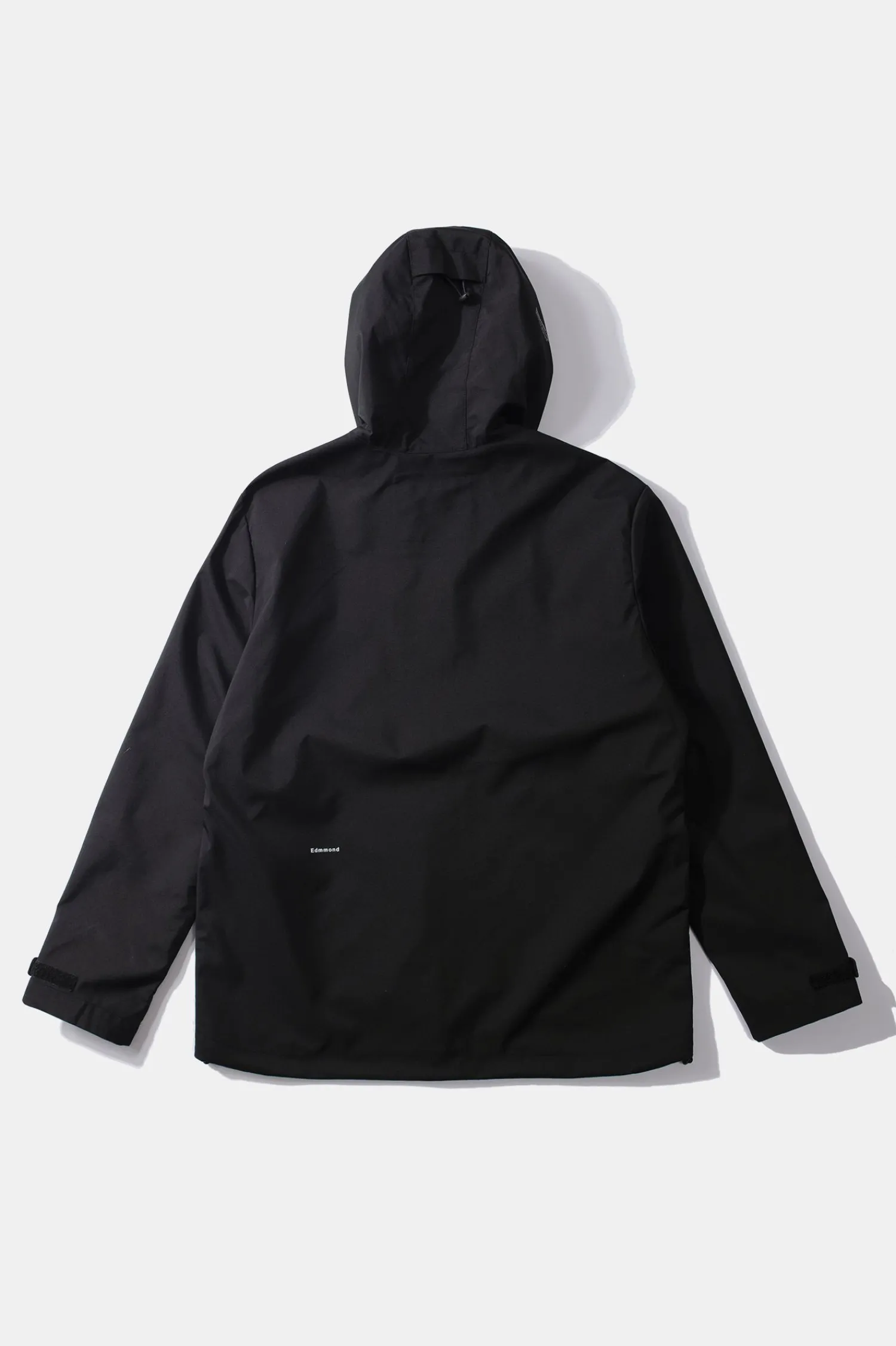 Chaqueta De Color Negro. Capucha Ajustable Y Mangas Con Velcro. Tiene Bolsillos Exteriores Orientados En Diagonal.