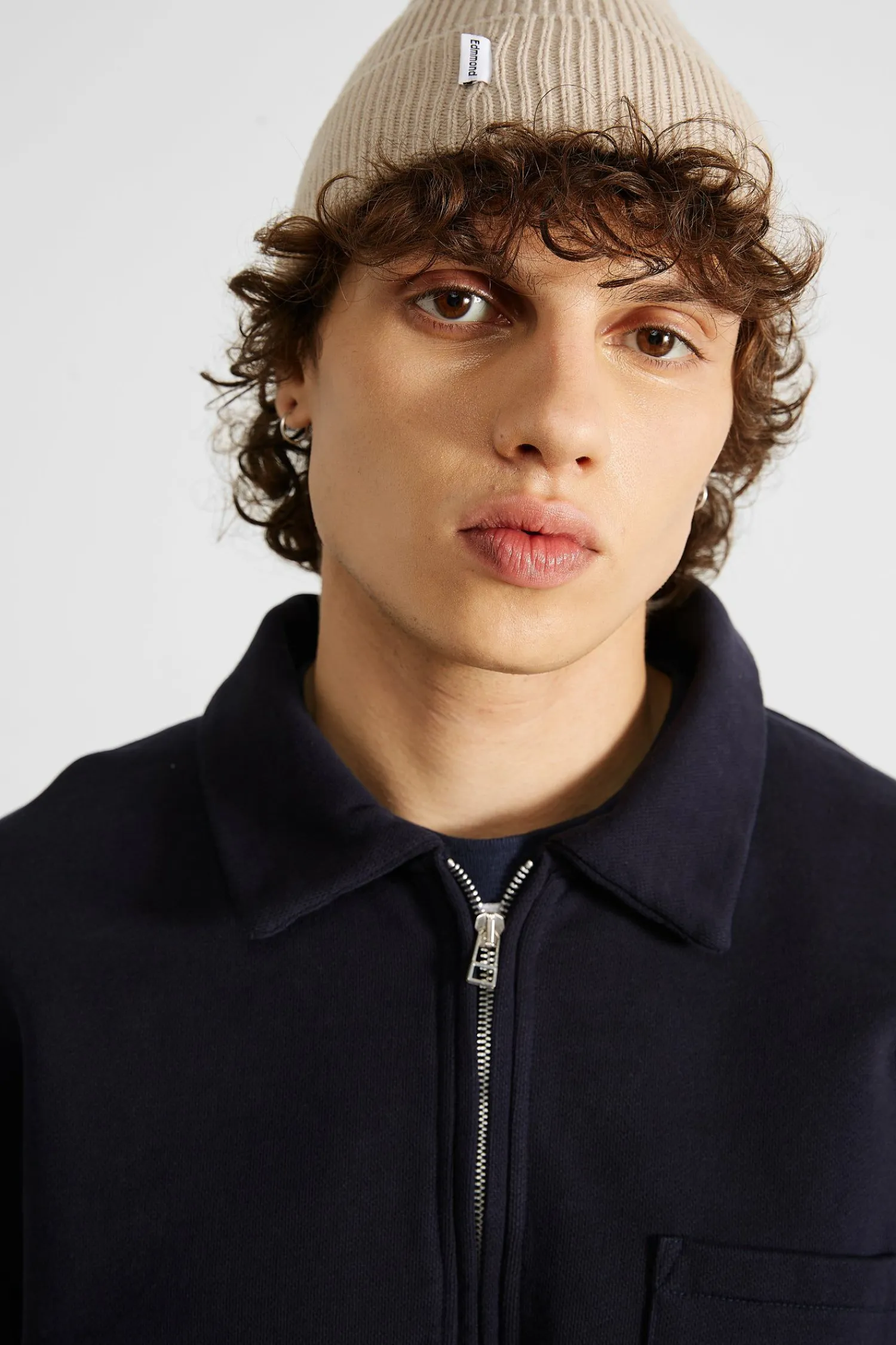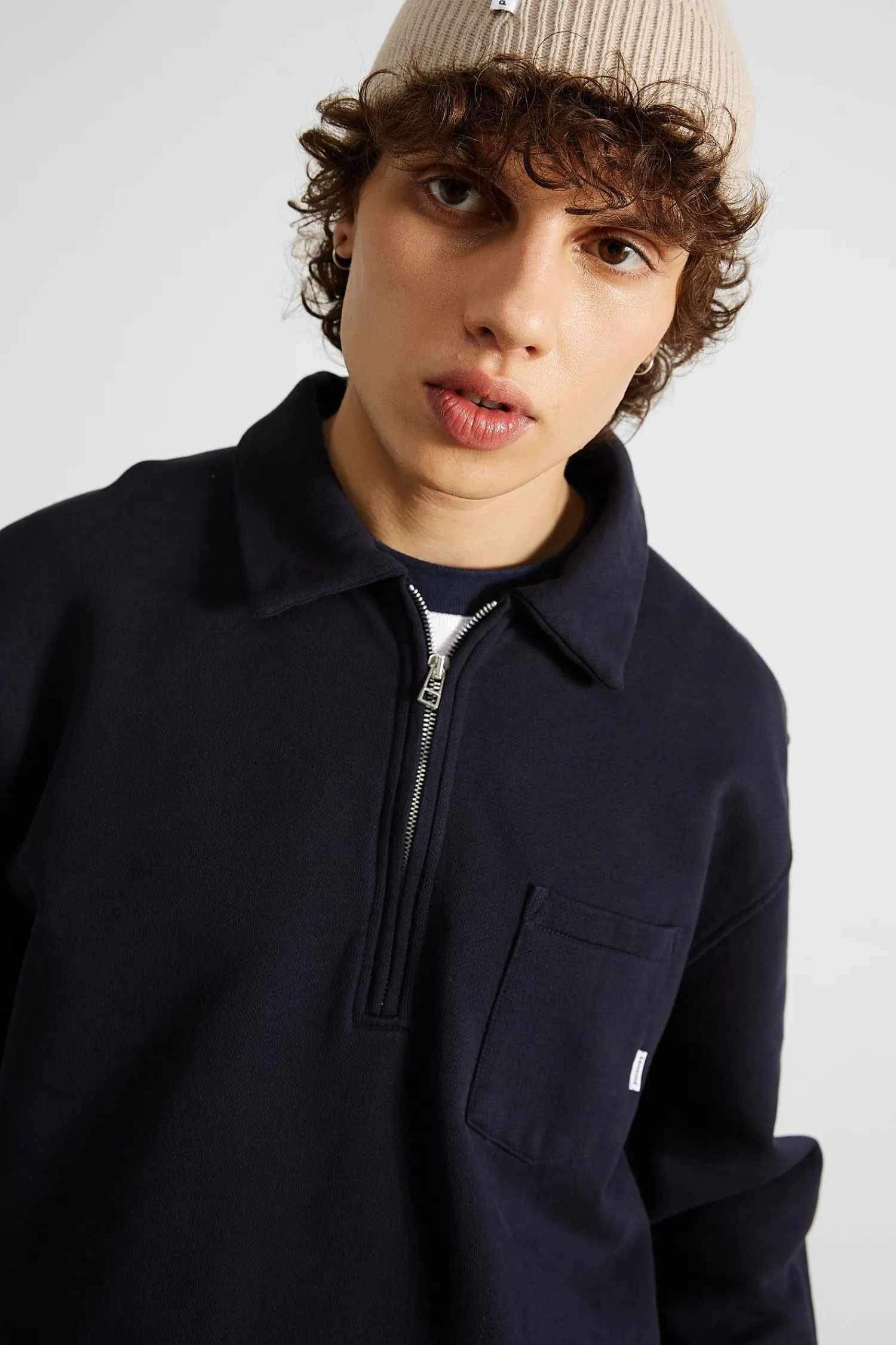 Sudadera Lisa Azul Marino. Confeccionada Con Algodon 100% Organico De 320Gr. Canale Redondo, Cuello Con Solapa, Una Pequena Cremallera Que Llega Al Pecho Y Un Bolsillo En La Parte Superior Izquierda.