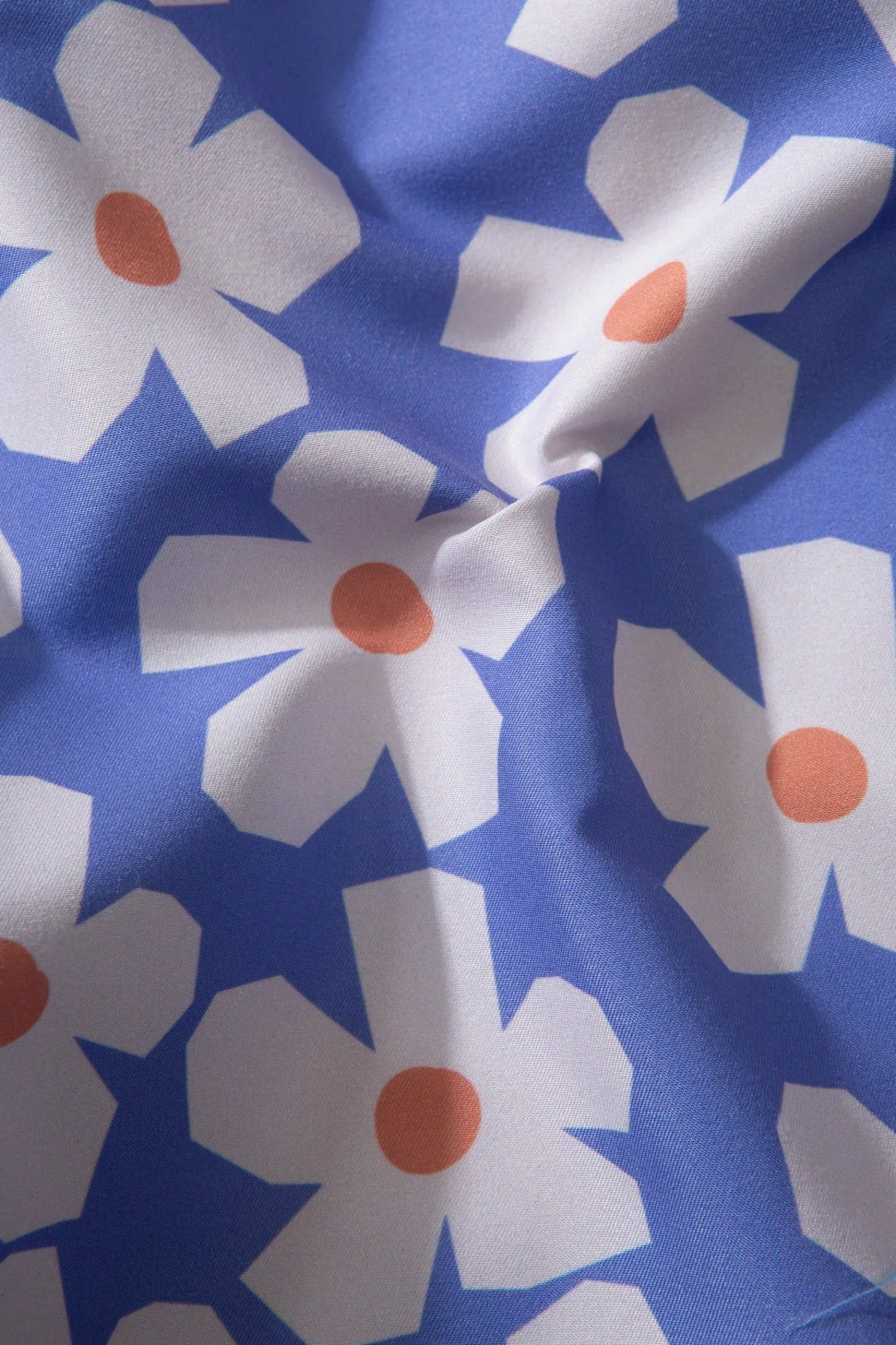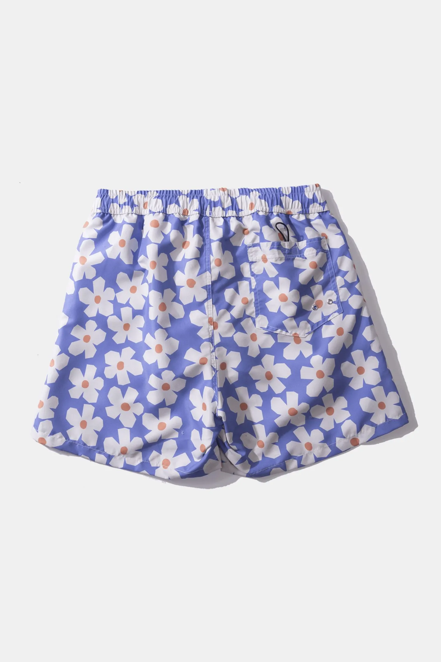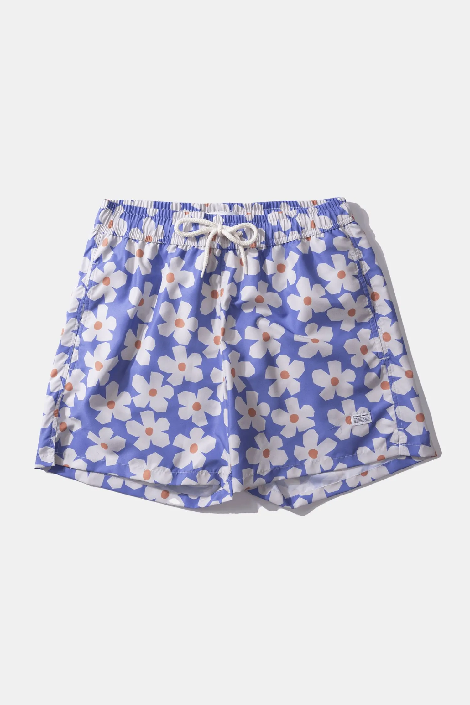 Banador Morado Con Estampado Floral, Cintura Elastica Y Cordon Ajustable. El Estampado Ha Sido Disenado En El Estudio Creativo De Madrid Y Fabricado En Portugal.