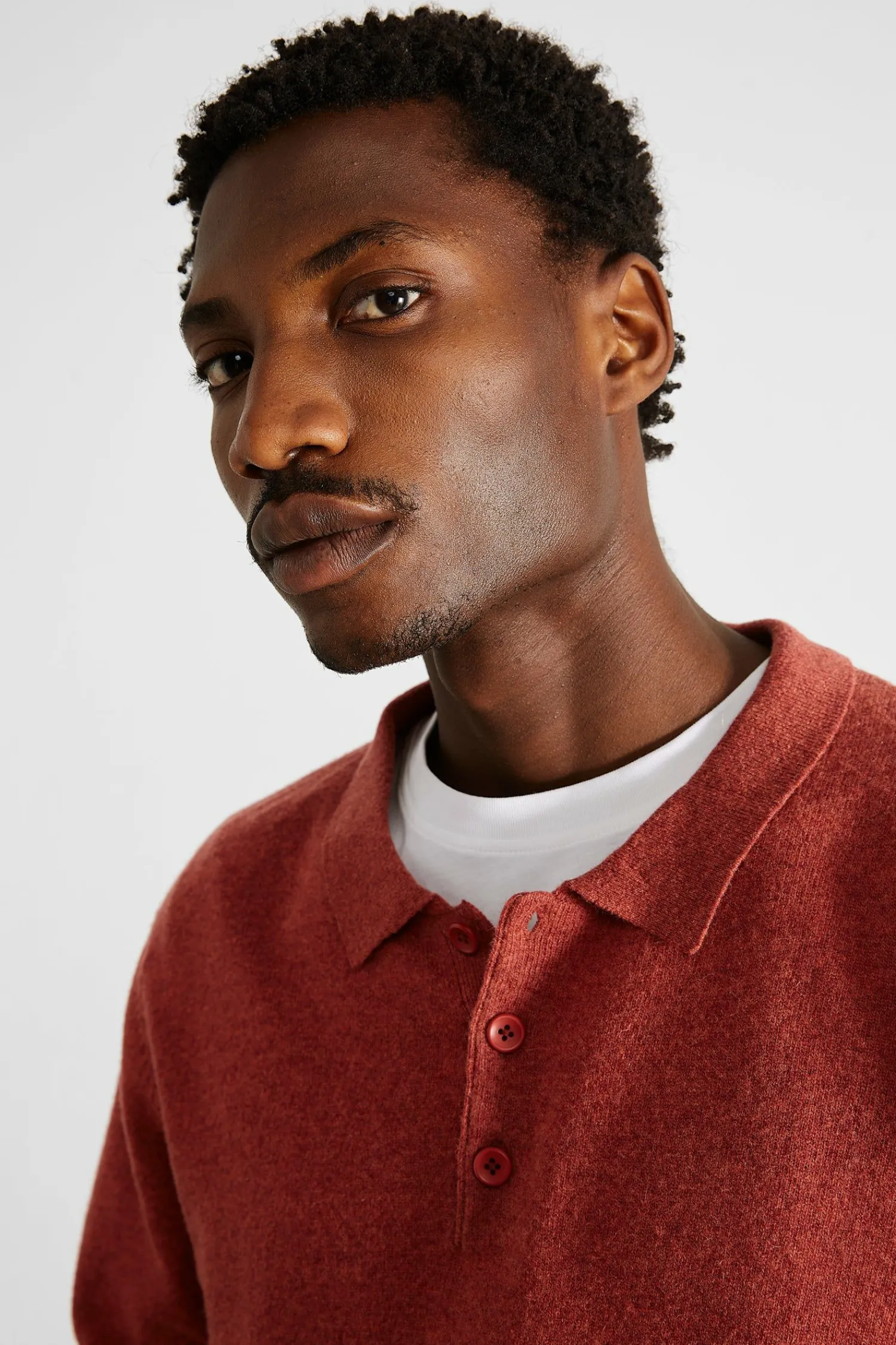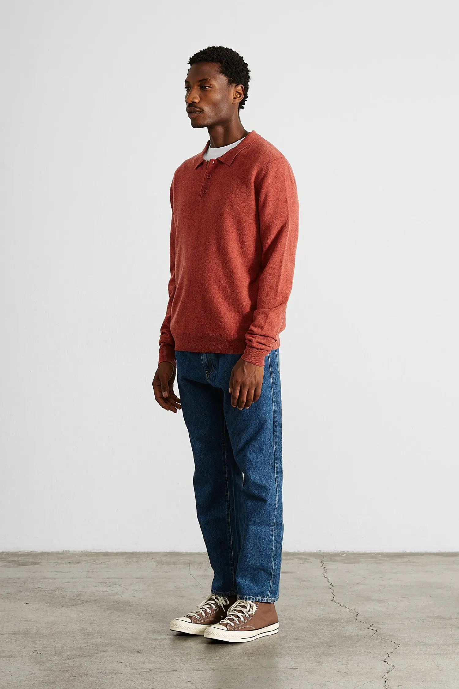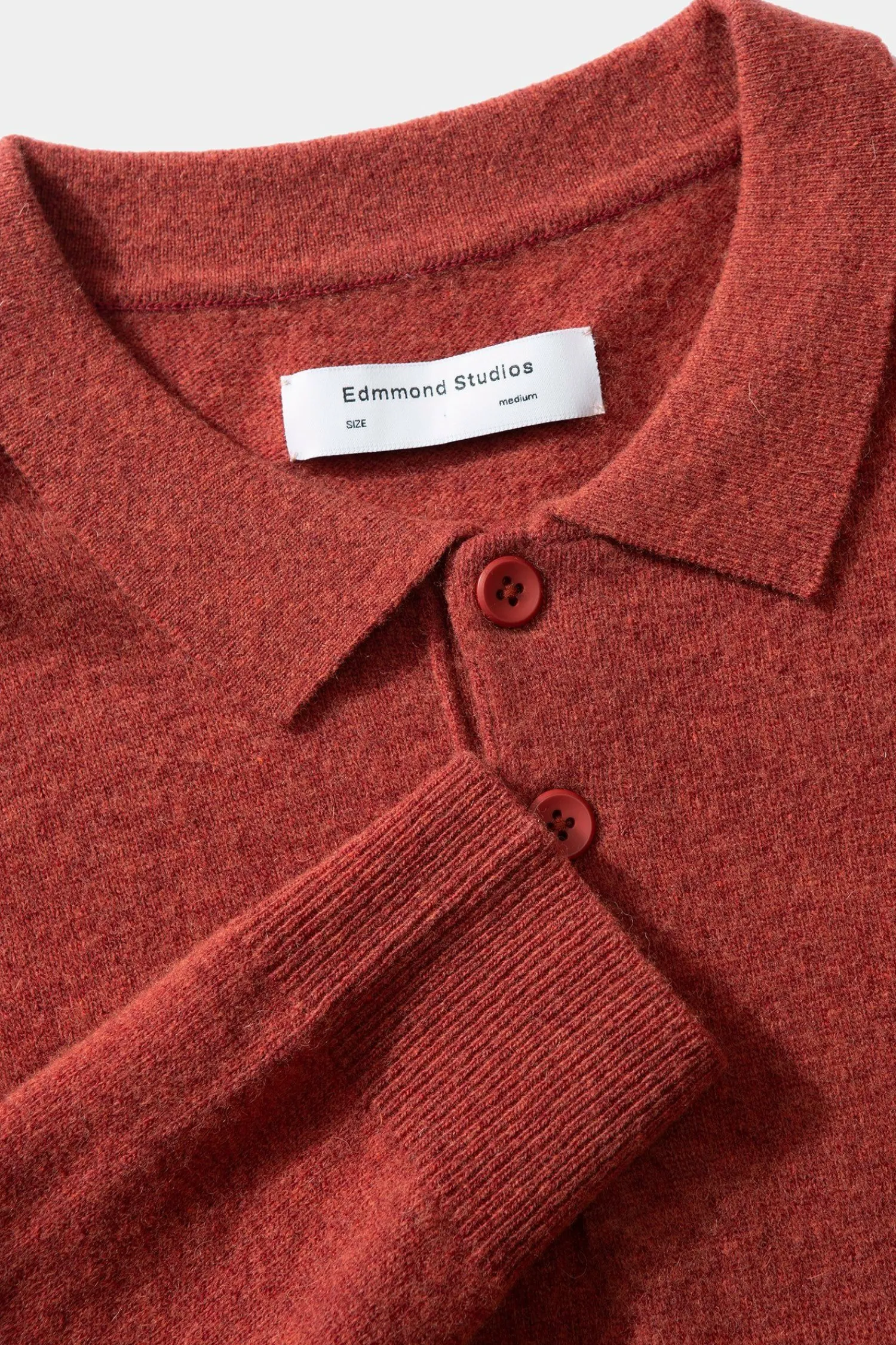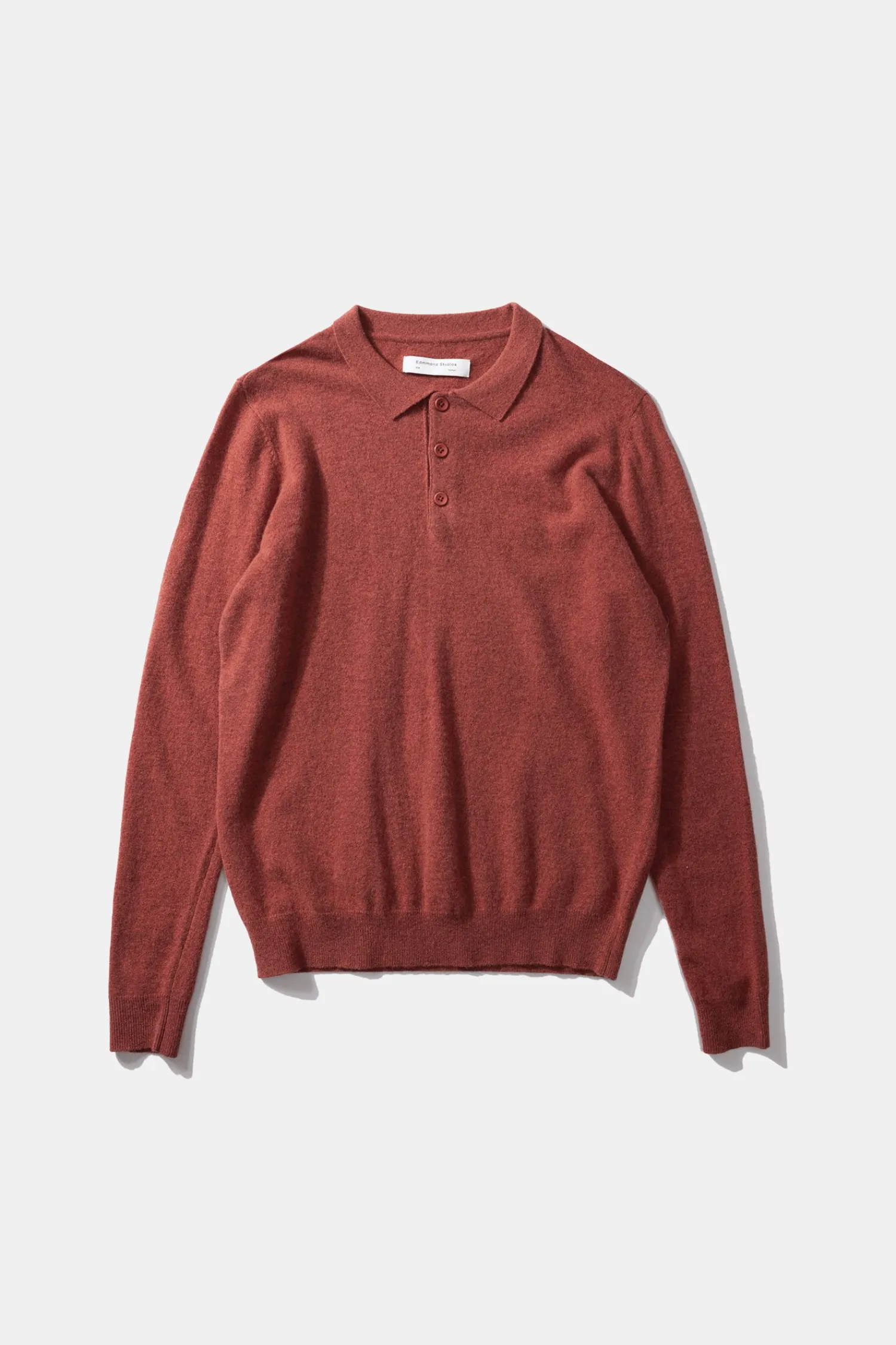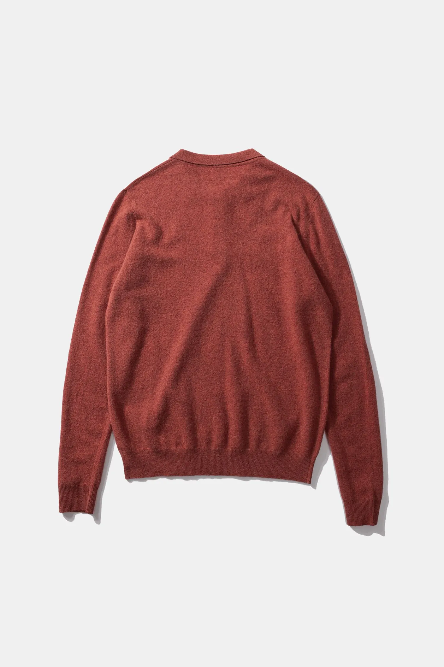 Polo De Punto De Manga Larga Y Cuello Camisero Abotonado En Color Cobrizo. Tiene Tres Botones Debajo Del Cuello Y Un Diseno Suave Y Liso Que Se Extiende Hasta El Dobladillo Y Los Punos De Las Mangas, Donde Se Aprecia El Tejido Acanalado.